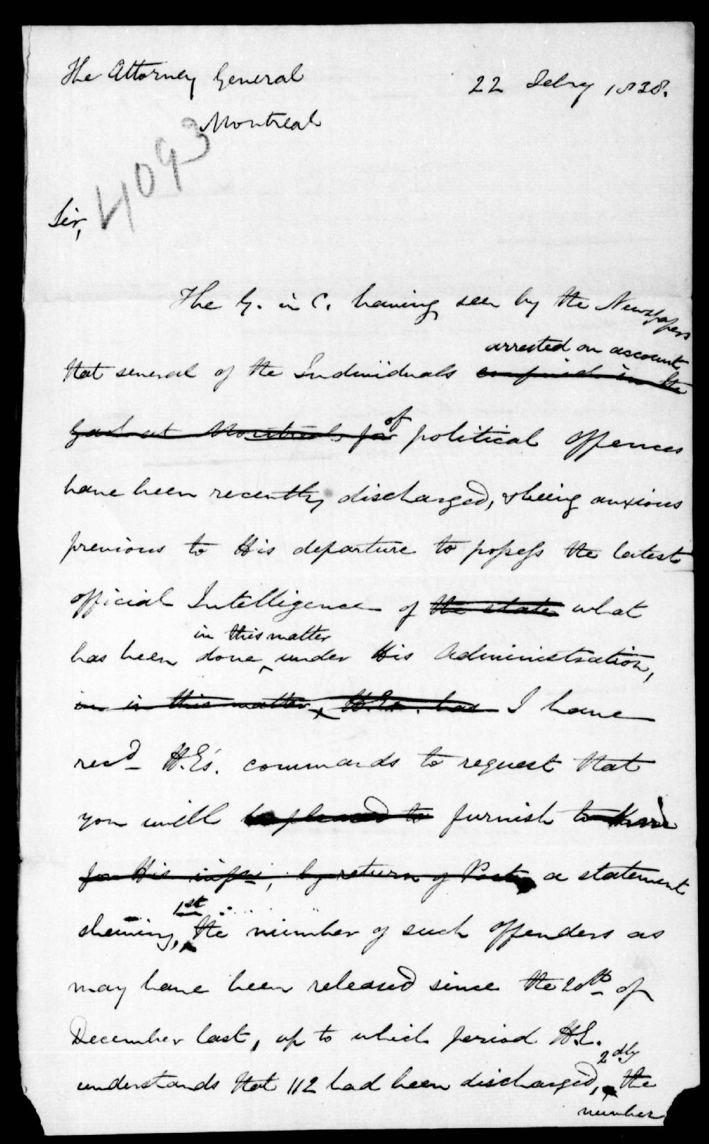 - Il devra fournir au gouverneur, qui doit partir le 27 février, une liste des personnes qui ont été remises en liberté depuis le 20 décembre 1837, après avoir été emprisonnées pour offenses politiques. Simple brouillon écrit à la hâte, n'ayant pour signature que les initiales W. R (William Rowan). Ce dossier fait partie d'un ensemble de documents intitulé : Lettres des secrétaires privées à diverses personnes