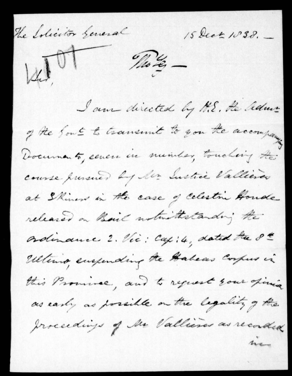 - Il lui demande de donner son opinion sur le cas du juge Vallières qui a admis, à caution, Célestin Houde. Thomas N. Leigh Goldie, secrétaire civil. Simple brouillon écrit à la hâte. Ce dossier fait partie d'un ensemble de documents intitulé : Lettres des secrétaires privées à diverses personnes