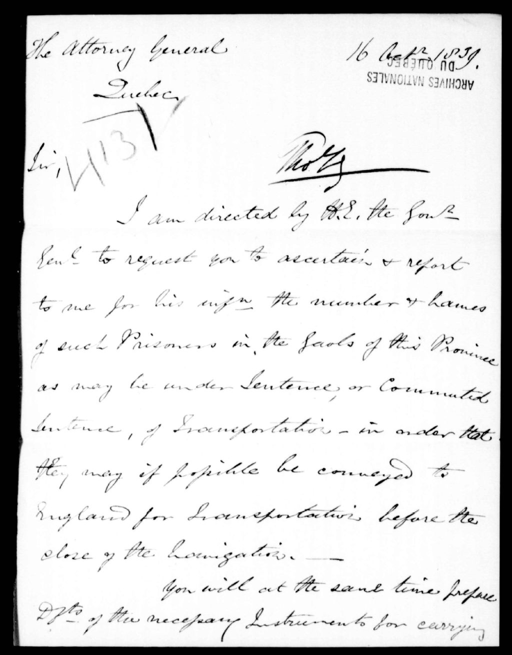 - Il voudra bien préparer les documents requis pour le transport, en Angleterre, de quelques prisonniers politiques. Thomas N. Leigh Goldie, secrétaire civil. Simple brouillon écrit à la hâte, n'ayant pour signature que les initiales T. L. G (Thomas Leigh Goldie). Ce dossier fait partie d'un ensemble de documents intitulé : Lettres des secrétaires privées à diverses personnes