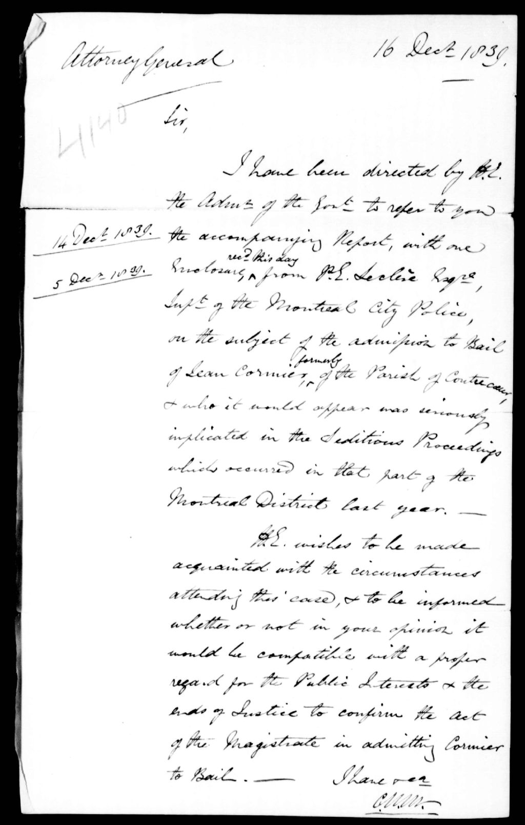 - Doit-on admettre, à caution, Jean Cormier, de Contrecoeur? Simple brouillon écrit à la hâte, n'ayant pour signature que les initiales C. M (C.-N. Montizambert). Ce dossier fait partie d'un ensemble de documents intitulé : Lettres des secrétaires privées à diverses personnes