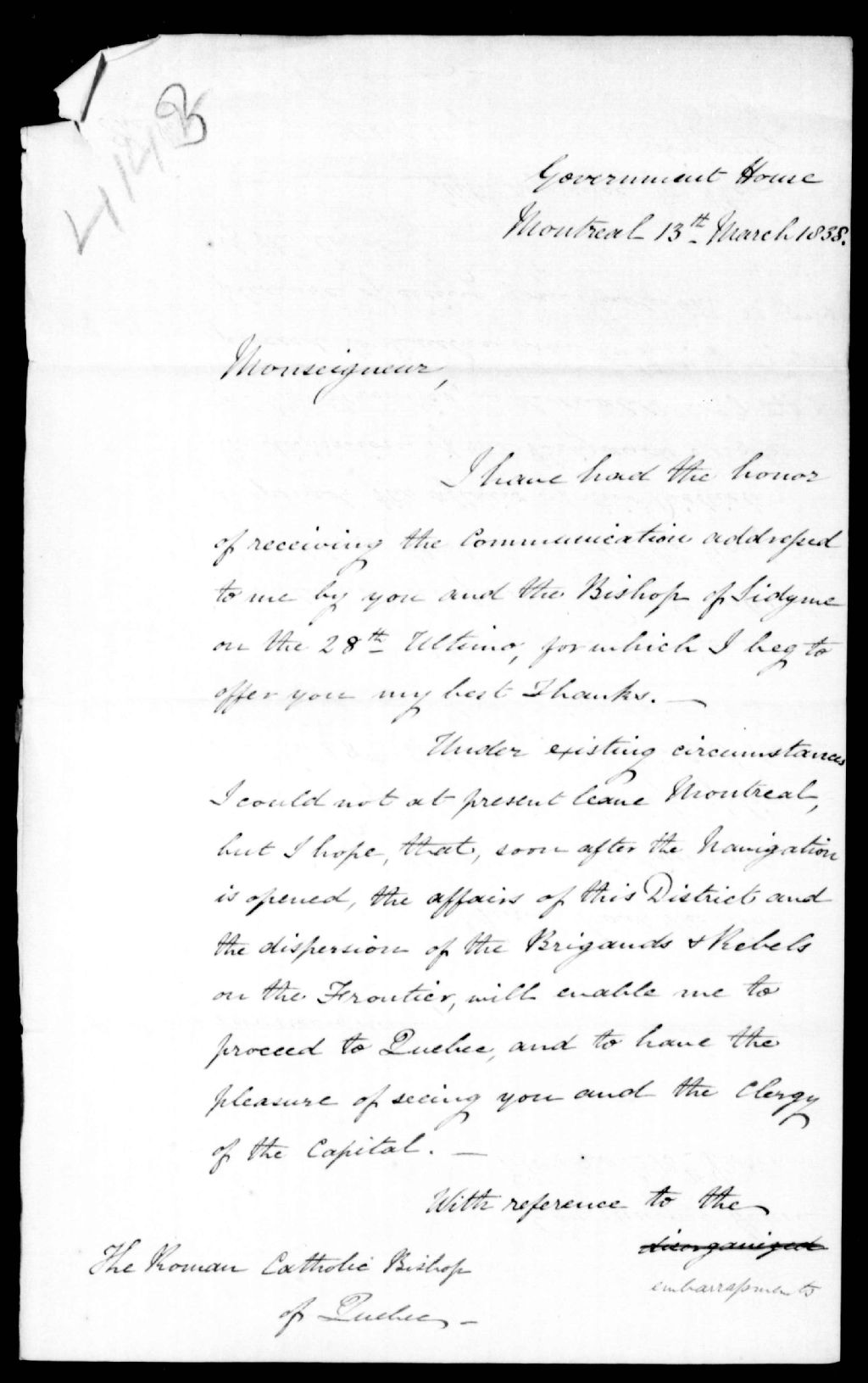 Lettre de Colborne à l'évêque catholique de Québec, 13 mars 1838, Archives nationales à Québec, Fonds Ministère de la Justice, (03Q,E17,S37,D4143).