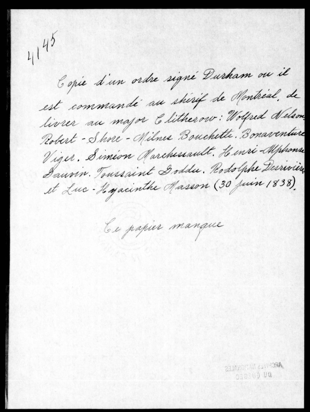 Copie d'un ordre signé Durham où il est commandé au shérif de Montréal, de livrer au major Clitherow: Wolfred Nelson, Robert-Shore-Milnes Bouchette, Bonaventure Viger, Siméon Marchessault, Henri-Alphonse Gauvin, Toussaint Goddu, Rodolphe Desrivières et Luc-Hyacinthe Masson, 30 juin 1838, Archives nationales à Québec, Fonds Ministère de la Justice, (03Q,E17,S37,D4145).