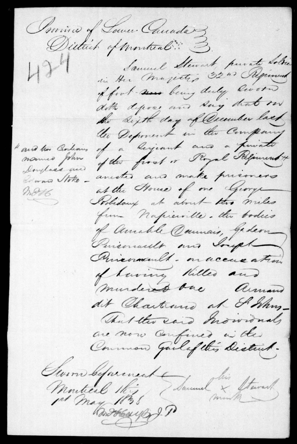 Déposition de Samuel Stewart concernant l'arrestation d'Amable Daunais, Gédéon Pinsonnault et Joseph Pinsonnault, supposés meurtriers de Chartrand, 1er mai 1838, Archives nationales à Québec, Fonds Ministère de la Justice, (03Q,E17,S37,D424).