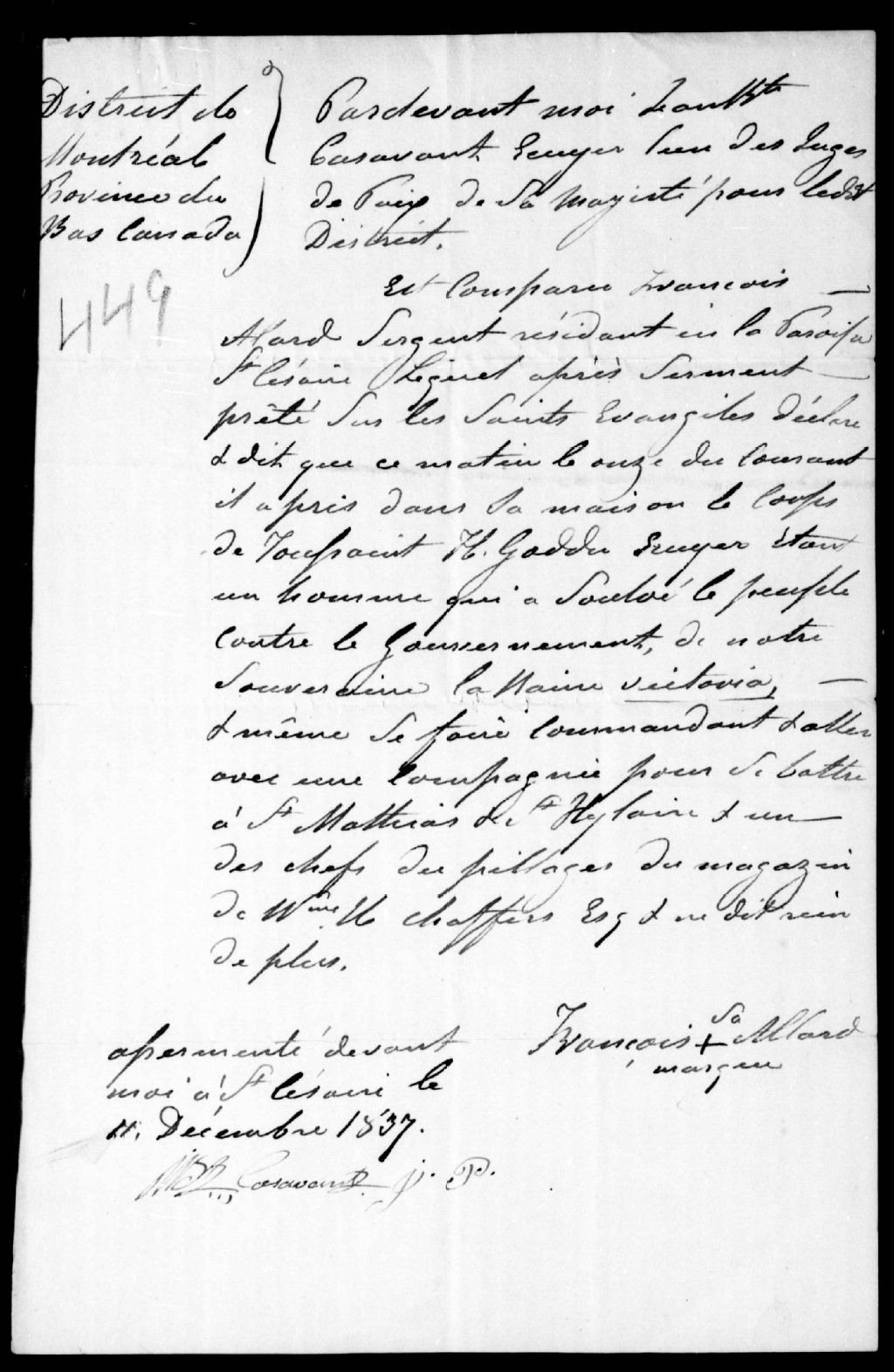 - Il a fait prisonnier Toussaint-Hubert Goddu. Ce dossier fait partie d'un ensemble de documents intitulé : Camp de la Pointe-Olivier (Saint-Mathias)