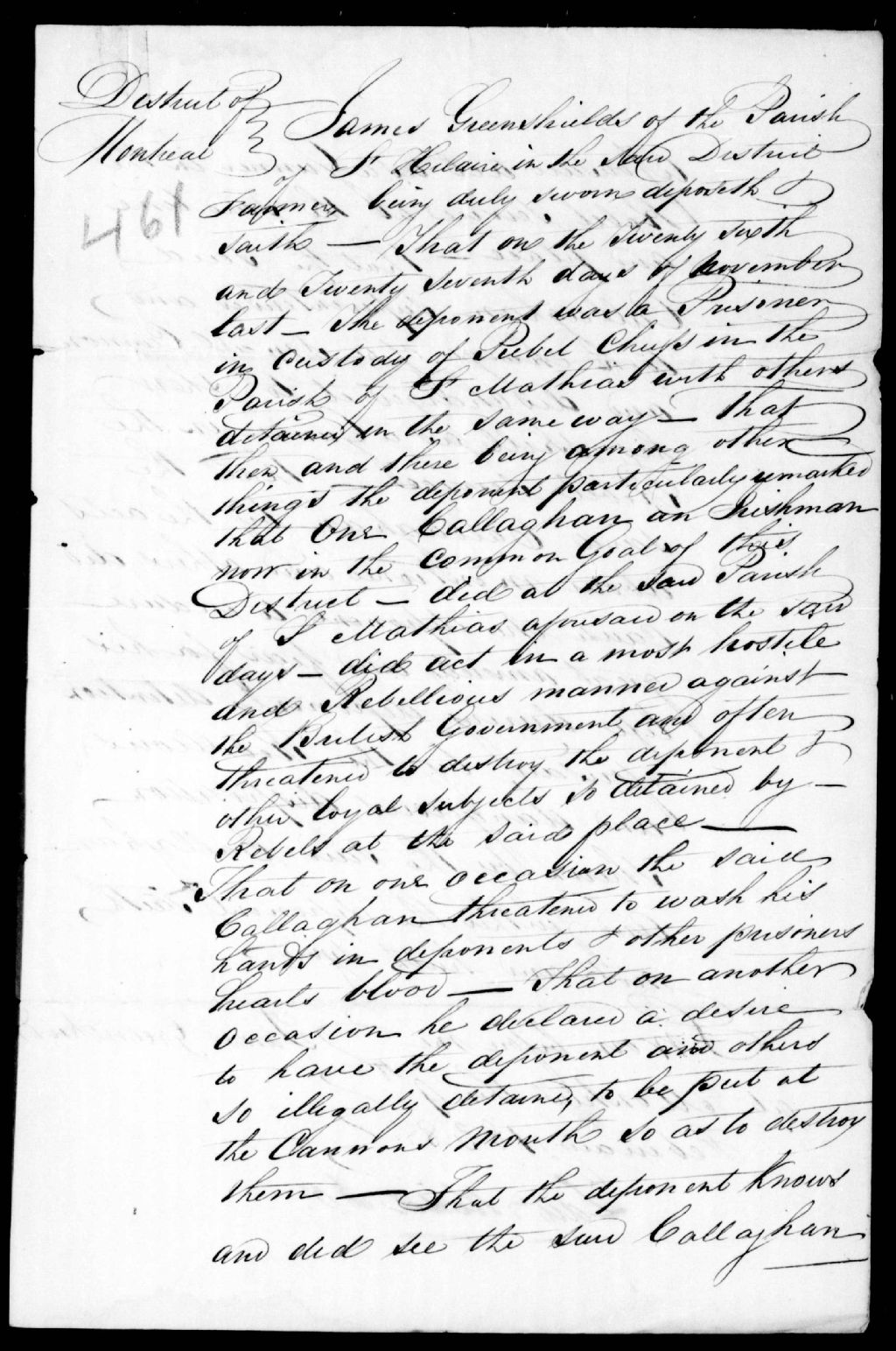 Déposition de James Greenshields, de Saint-Hilaire, contre Peter Callaghan, maître d'école
