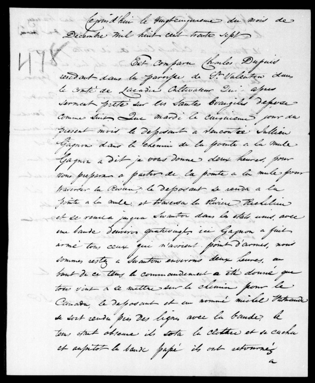 - Déposition de Charles Dupuis, de Saint-Valentin, contre Théodore Béchard, Julien Gagnon, Pierre Paradis