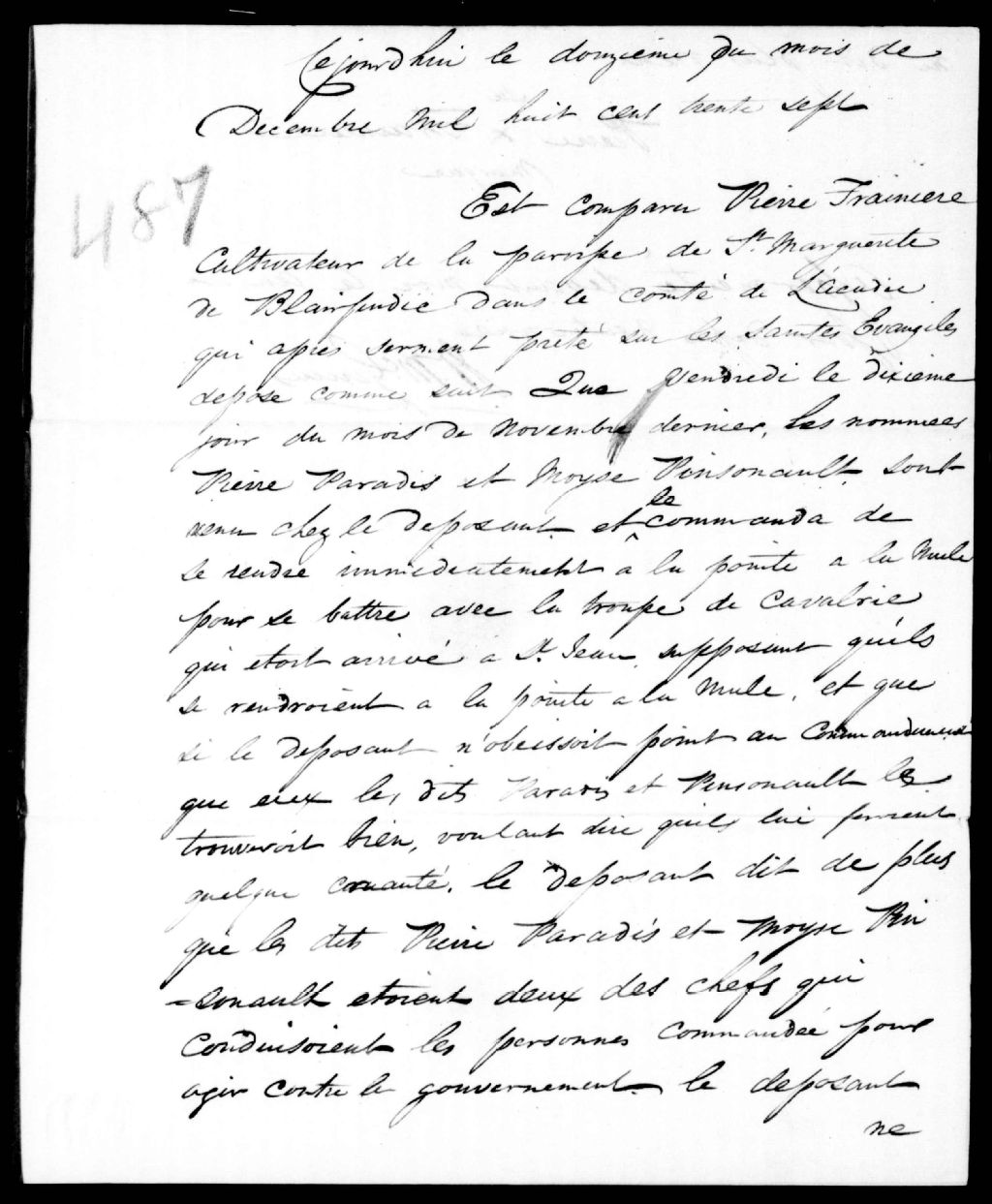 Déposition de Pierre Frainière, de Sainte-Marguerite, contre Pierre Paradis et Moïse Pinsonnault