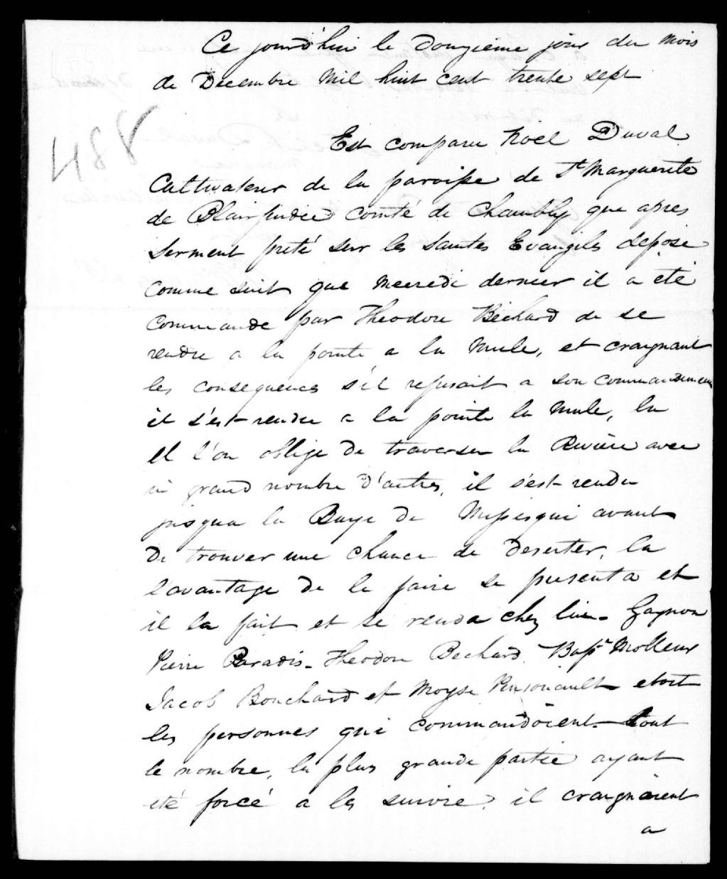 - Déposition de Noël Duval, de Sainte-Marguerite, contre Julien Gagnon, Pierre Paradis, Théodore Béchard, Baptiste Molleur, Joseph Bouchard et Moïse Pinsonnault
