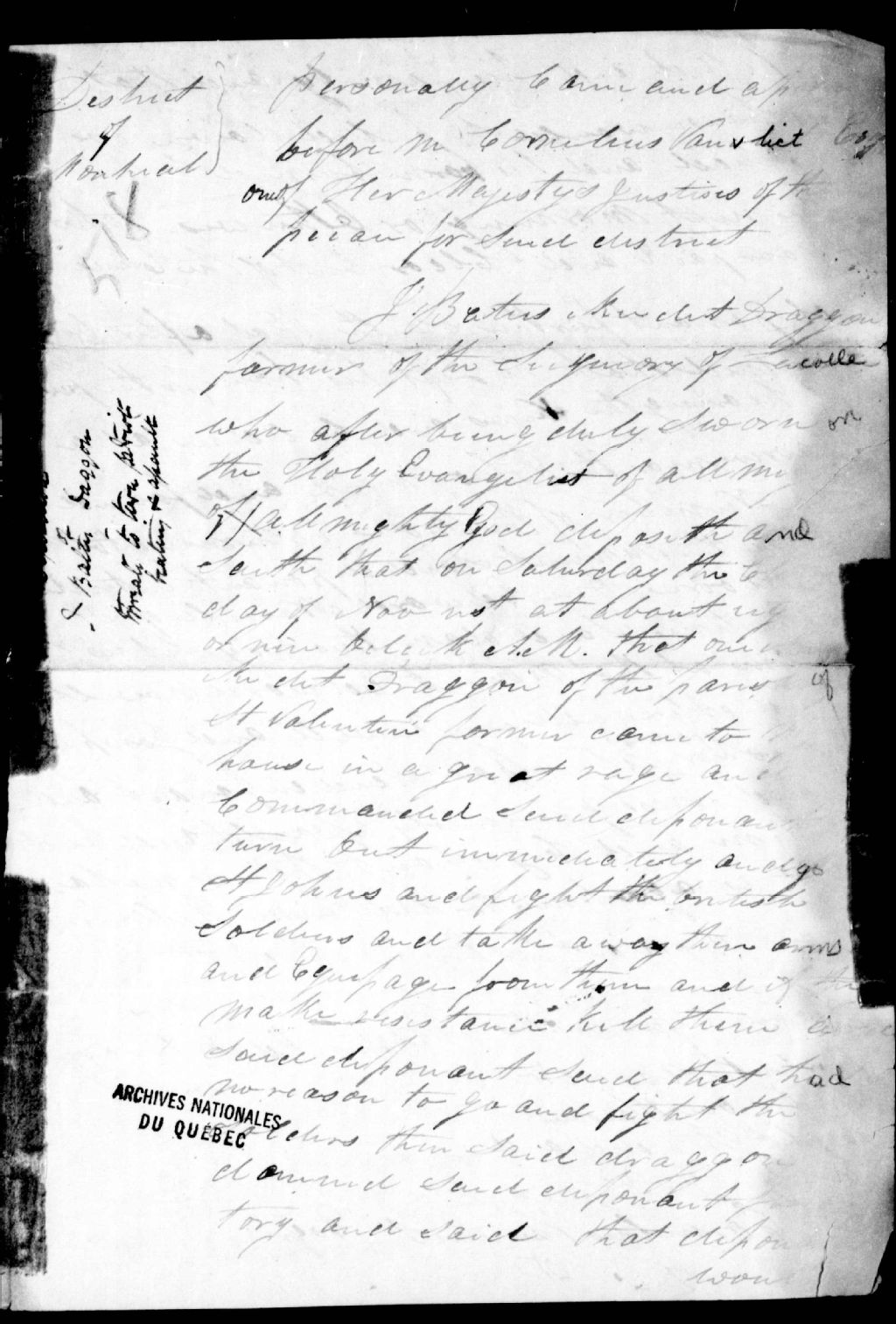 - À propos d'un assaut commis sur sa personne à l'île aux Noix. Ce dossier fait partie d'un ensemble de documents intitulé : Pointe-à-la-Mule (Saint-Valentin)