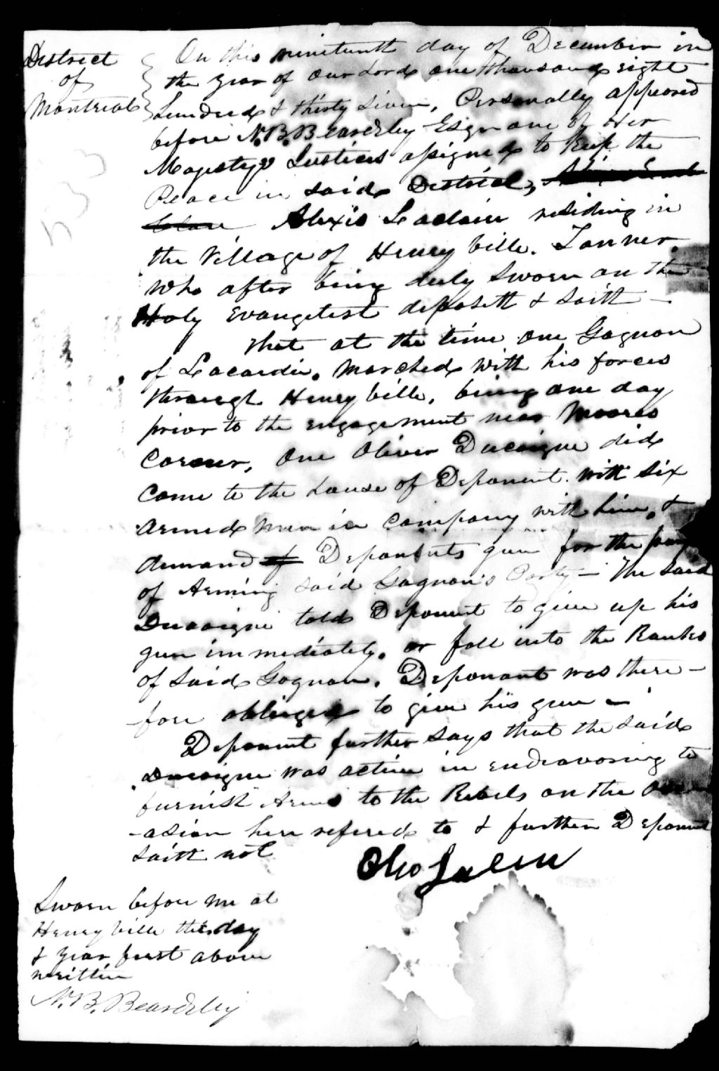 Déposition d'Alexis Leclaire, de Henryville, contre Julien Gagnon et Olivier Decoigne, 19 décembre 1837, Archives nationales à Québec, Fonds Ministère de la Justice, (03Q,E17,S37,D533).