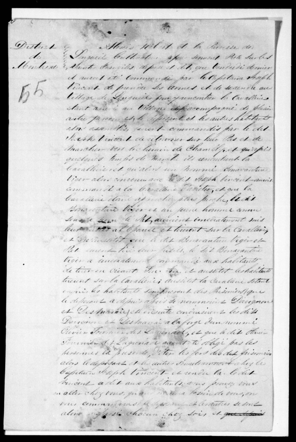 Déposition d'Alexis Hébert, cultivateur, de Longueuil, 22 novembre 1837, Archives nationales à Québec, Fonds Ministère de la Justice, (03Q,E17,S37,D55).