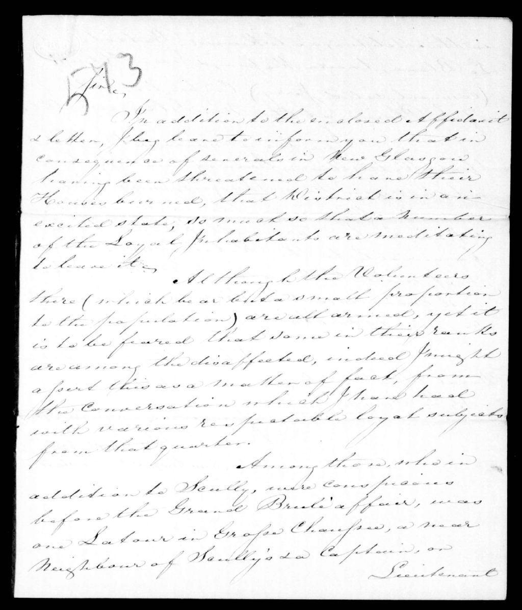 John Grant, capitaine (New Glasgow Loyal Volunteers) à Charles Richard Ogden, procureur général, 15 février 1838, Archives nationales à Québec, Fonds Ministère de la Justice, (03Q,E17,S37,D573).