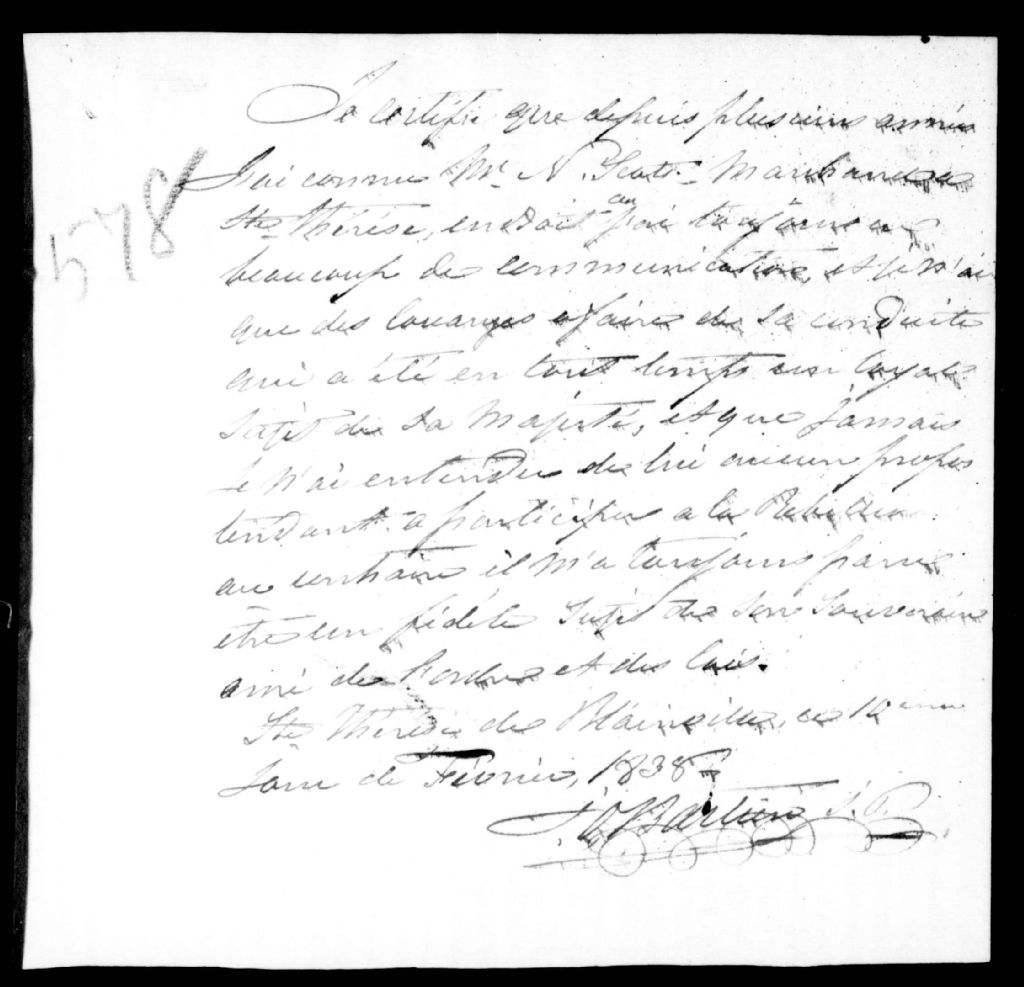 Certificat de J.-O. Bastien, en faveur de Neil Scott, marchand, de Sainte-Thérèse-de-Blainville, 10 février 1838, Archives nationales à Québec, Fonds Ministère de la Justice, (03Q,E17,S37,D578).