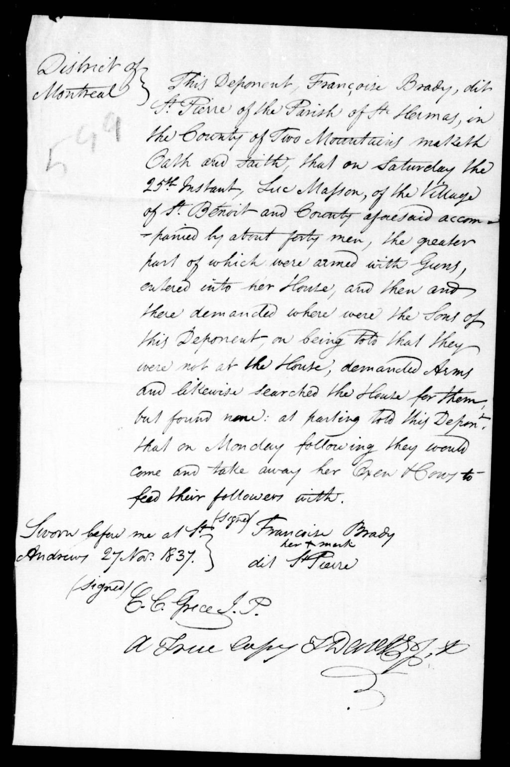 Déposition de François Brady dit Saint-Pierre, de Saint-Hermas, contre Hercule Dumouchelle et Luc Masson, médecin, de Saint-Benoît, 27 novembre 1837, Archives nationales à Québec, Fonds Ministère de la Justice, (03Q,E17,S37,D599).