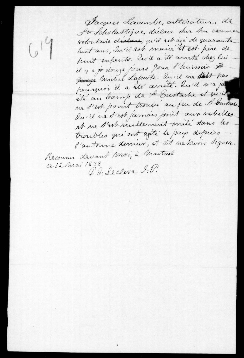 Examen de Jacques Lacombe, de Sainte-Scholastique, 12 mai 1838, Archives nationales à Québec, Fonds Ministère de la Justice, (03Q,E17,S37,D619).