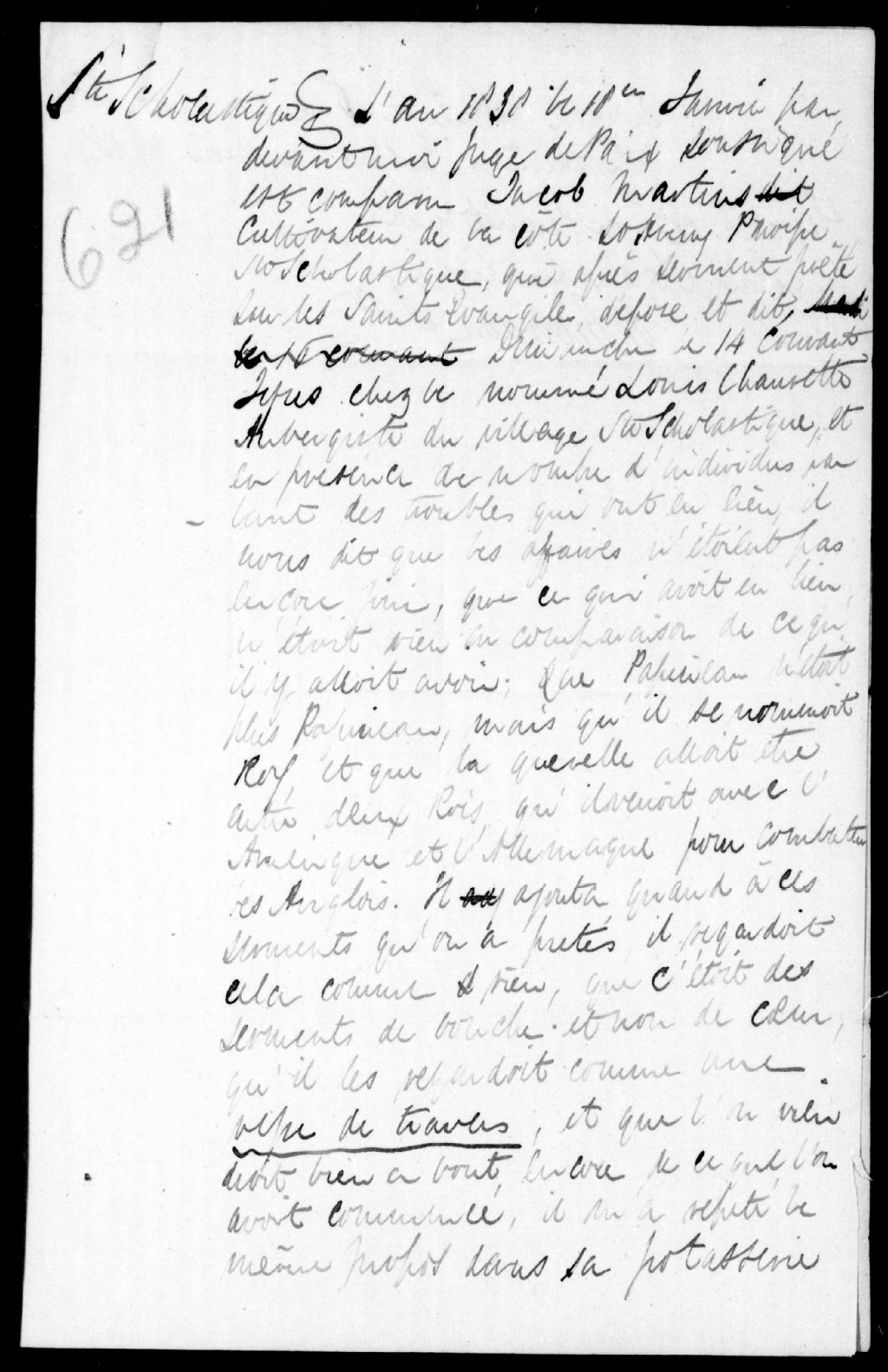 - Déposition de Jacob Martius, de Sainte-Scholastique, contre Louis Chaurette