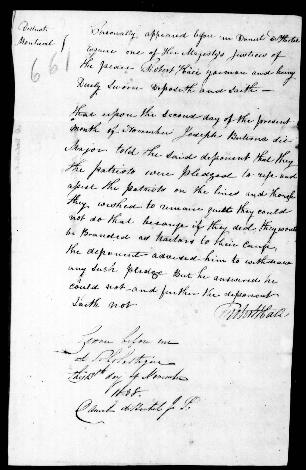 - Déposition de Robert Hall, de Sainte-Scholastique, contre Joseph Beautron dit Major