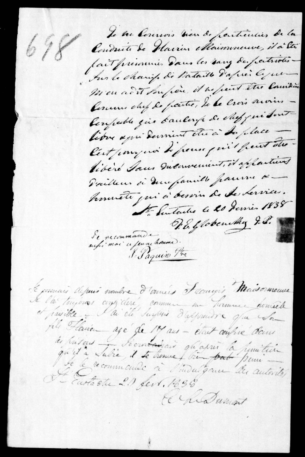 - Certificats de F.-E. Globensky, J. Paquin, prêtre et C.-M. Dumont, en faveur de Flavien Maisonneuve