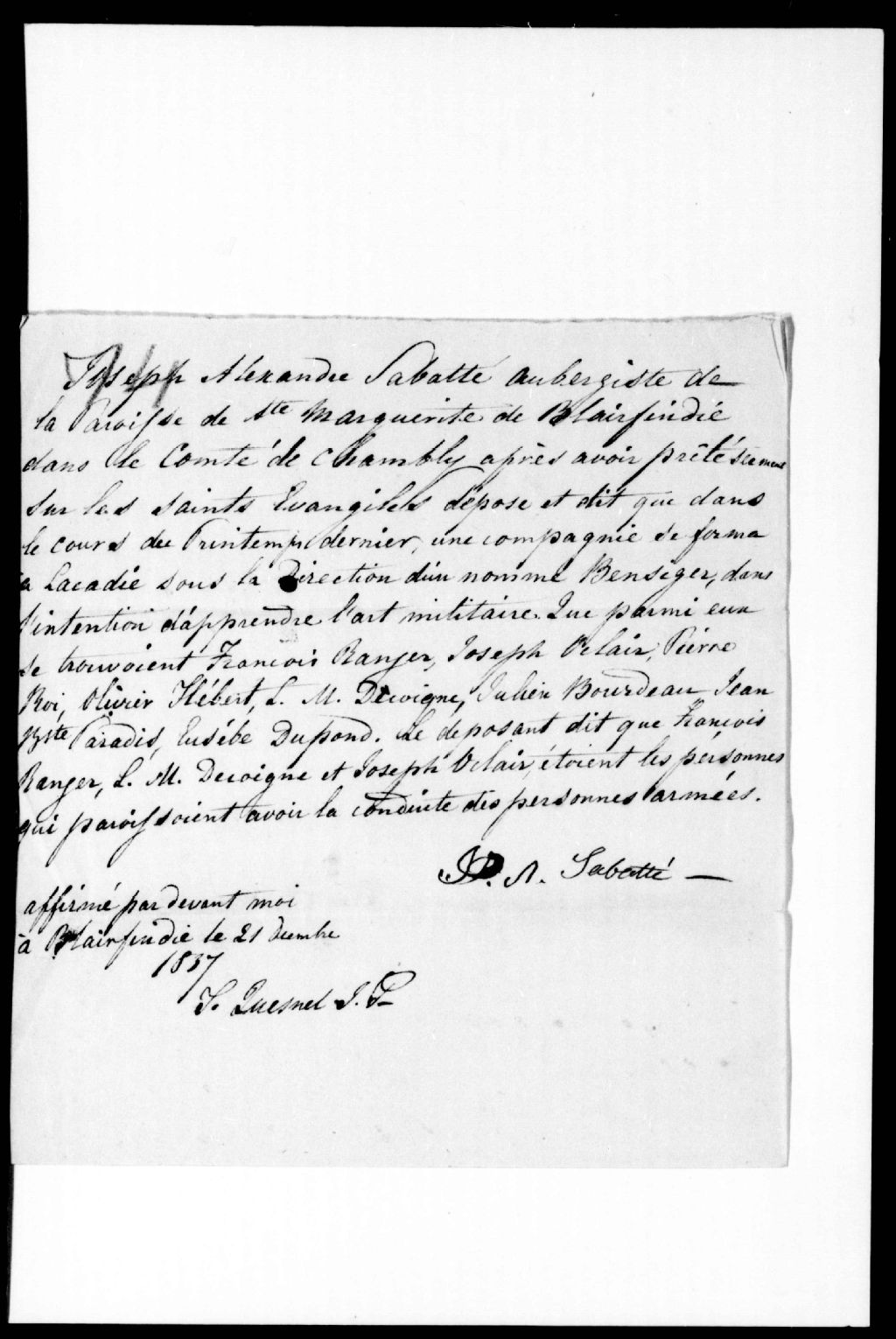 Déposition de Joseph-Alexandre Sabatté, aubergiste, de Sainte-Marguerite-de-Blairfindie, contre François Ranger, Louis-Marc Decoigne, Joseph Auclair Pierre Roy, Olivier Hébert, Julien Boudreau, Jean-Bapiste Paradis et Eusèbe Dupond (Dupont), 21 décembre 1837, Archives nationales à Québec, Fonds Ministère de la Justice, (03Q,E17,S37,D74).