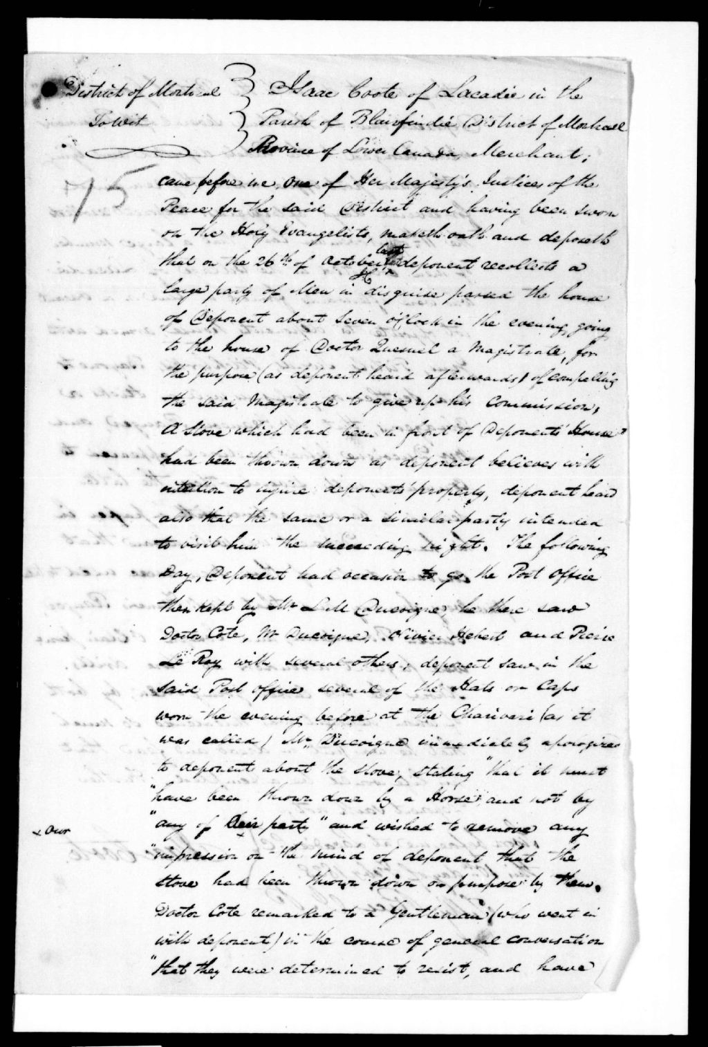 - Déposition d'Isaac Coote, marchand, de l'Acadie, contre François Ranger, Louis-Marc Decoigne, Joseph Auclair Pierre Roy, Olivier Hébert, Julien Boudreau, Jean-Bapiste Paradis et Eusèbe Dupond (Dupont)