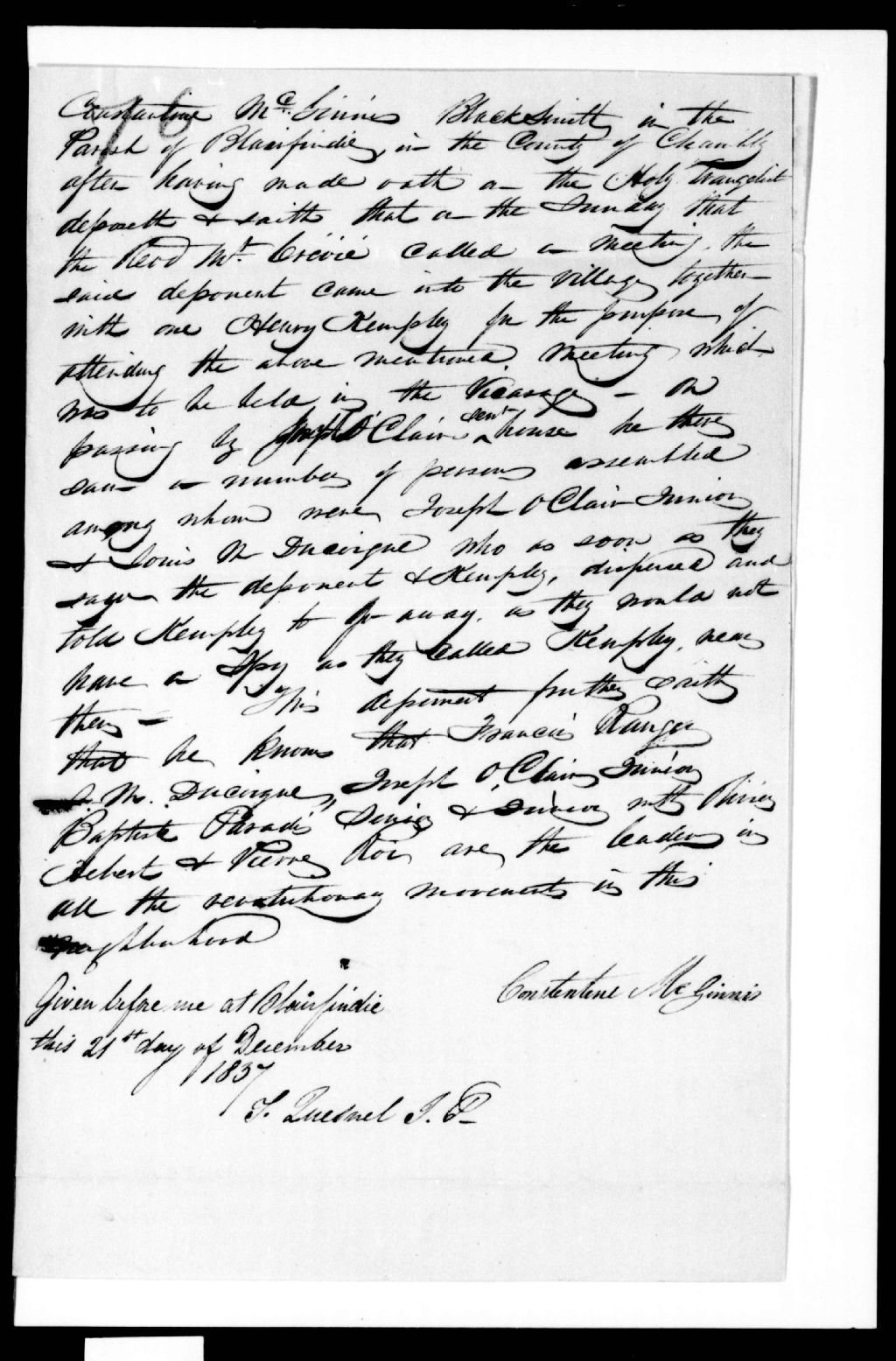 Déposition de Constative McGinnis, forgeron, de Sainte-Marguerite-de-Blairfindie contre François Ranger, Louias Marc Decoigne, Joseph Auclair, junior, Baptiste Paradis, senoir et junior, Olivier Hébert et Pierre Roy