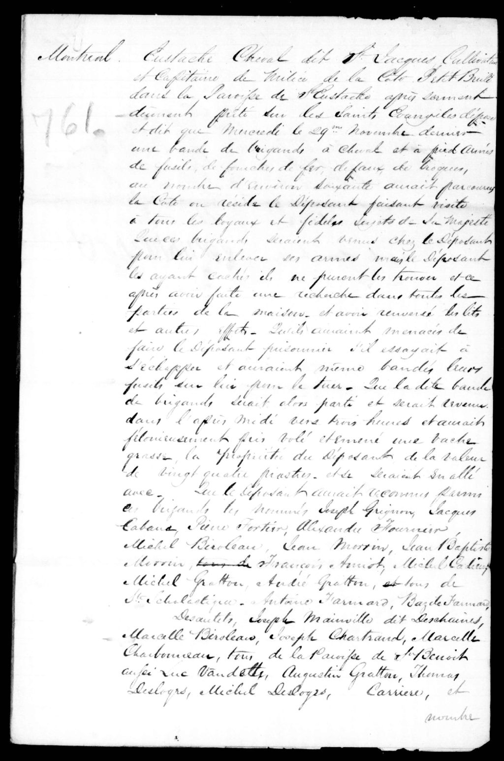 - Déposition d'Eustache Cheval dit Saint-Jacques contre plusieurs citoyens de Sainte-Scholastique qui sont allés saccager ses propriétés