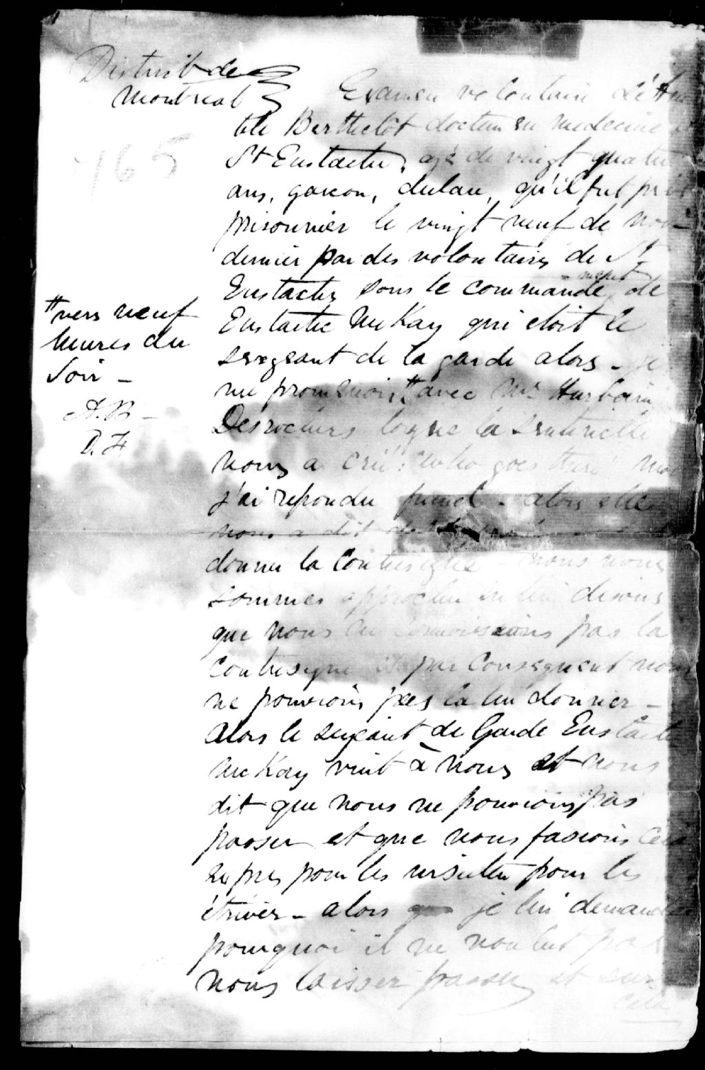 - Il raconte les circonstances de son arrestation qui a eu lieu en même temps que celle d'Urbain Desrochers. Ce dossier fait partie d'un ensemble de documents intitulé : Saint-Eustache (Décembre 1837)