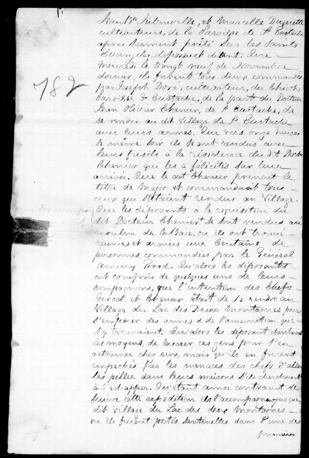 Déposition de Jean-Baptiste Jubinville et Marcelle Duquette contre le docteur Chénier, Amury Girod et Richard Hubert, 9 décembre 1837, Archives nationales à Québec, Fonds Ministère de la Justice, (03Q,E17,S37,D782).