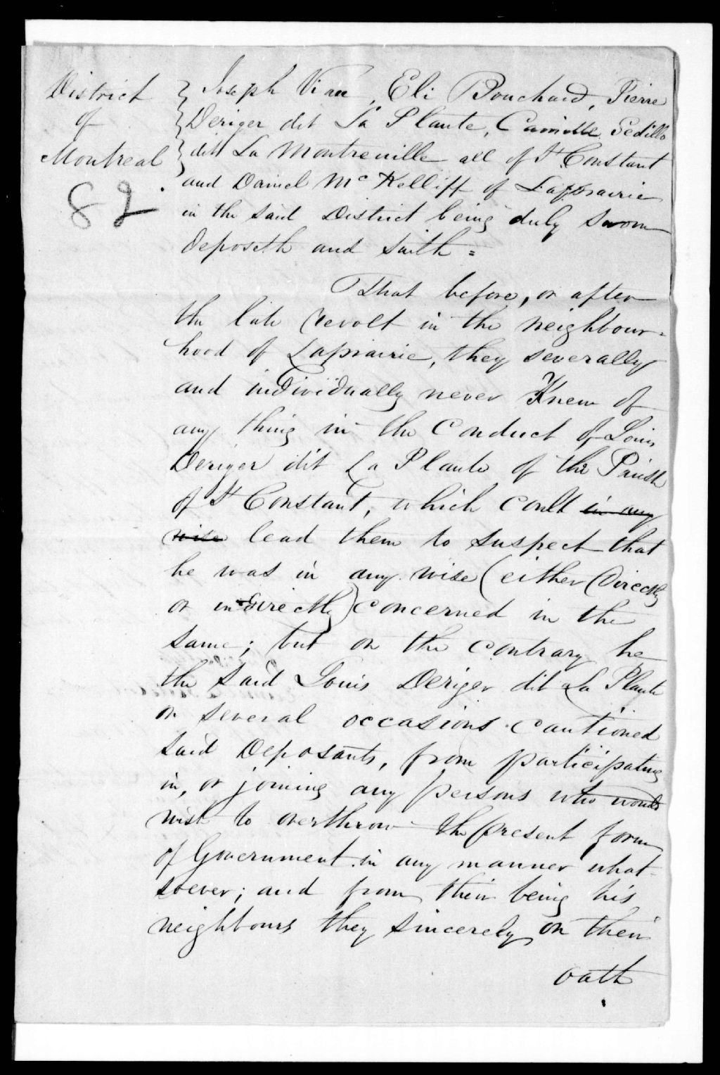 Déposition de Joseph Viau, Eli Bouchard, Pierre Dériger [ Lérigé] dit La Plante, Camille Sédillot dit La Montreuille (sic) tous de Saint-Constant, et Daniel Mc Kelliff, de Laprairie, en faveur de Louis Lérigé dit Laplante, fils