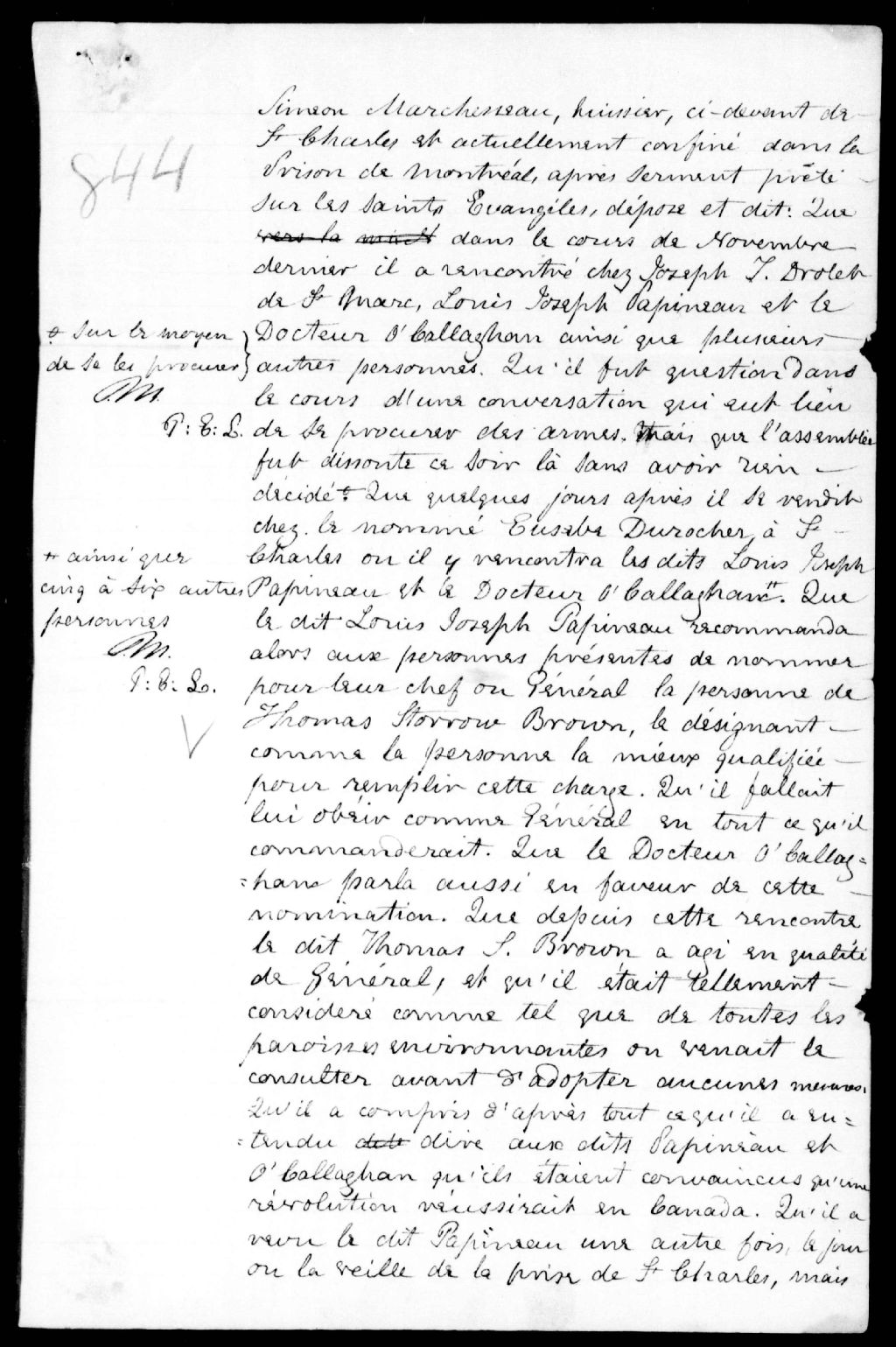 Le déposant dit qu'il a rencontré Louis-Joseph Papineau et le docteur O'Callaghan chez Joseph-Toussaint Drolet, de Saint-Marc, et Eusèbe Durocher, de Saint-Charles, dans le cours de novembre 1837. Le jour de la bataille de Saint-Charles, messire Blanchet, curé de la paroisse, se rendit au camp et exhorta les rebelles à se préparer à mourir, et leur fit réciter cinq Pater, cinq Ave, et l'acte de contrition. Voir les numéros 292 et 341. Ce dossier fait partie d'un ensemble de documents intitulé : Louis-Joseph Papineau
