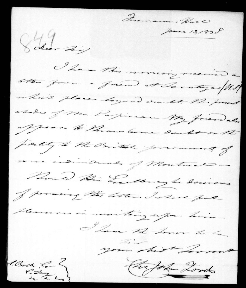 Chas (Charles) John Lord à Buller, secrétaire civil, Freemasons'Hall, 13 juin 1838, Archives nationales à Québec, Fonds Ministère de la Justice, (03Q,E17,S37,D849).