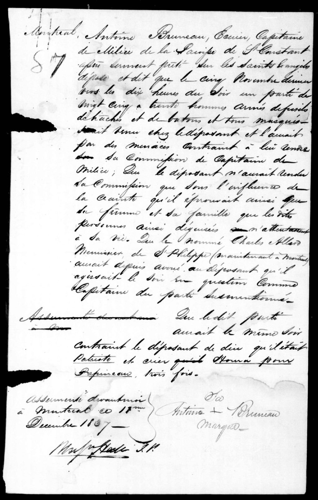 - Affidavit d'Antoine Bruneau, capitaine de Milice, Saint-Constant de Saint-Constant, contre Charles Allard, meunuisier, de Saint-Philippe, maintenant de Montréal