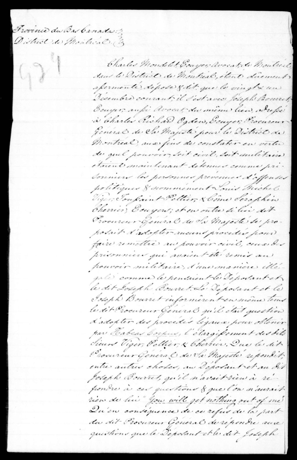 Affidavit de Charles Mondelet, 22 décembre 1837, Archives nationales à Québec, Fonds Ministère de la Justice, (03Q,E17,S37,D929).