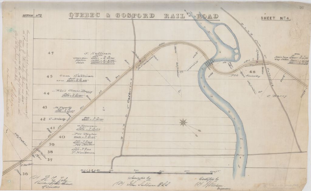 - Sur ces plans de chemin de fer situé dans la seigneurie Saint-Gabriel figurent une partie du canton Gosford, une partie de la rivière Jacques-Cartier, le chemin Plante, la première, la deuxième et la troisième concession Saint-Claude et la concession Saint-Michel. On y retrouve également le numéro et la dimension des lots, les bâtiments, la forge, les chemins, le pont, les chutes, le moulin, la réserve indienne de quarante arpents, le traversier, le nom d'environ 50 propriétaires ainsi que les noms moulin l'Heureux et Quebec & Gosford Rly