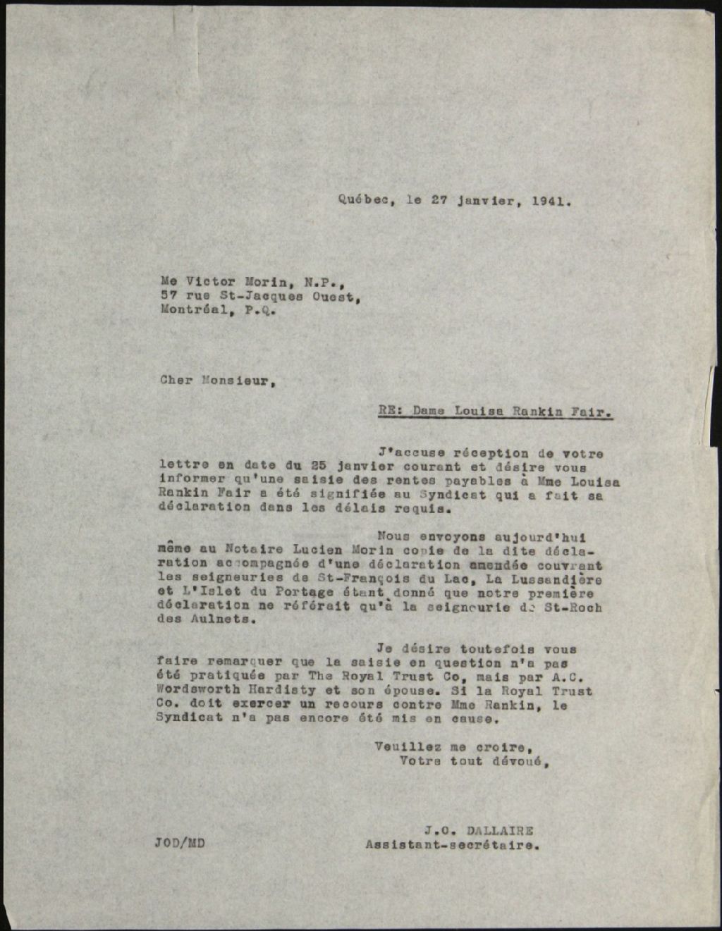 - Madame Louisa Rankin Fair, seigneurie de Saint-Roch des Aulnaies
