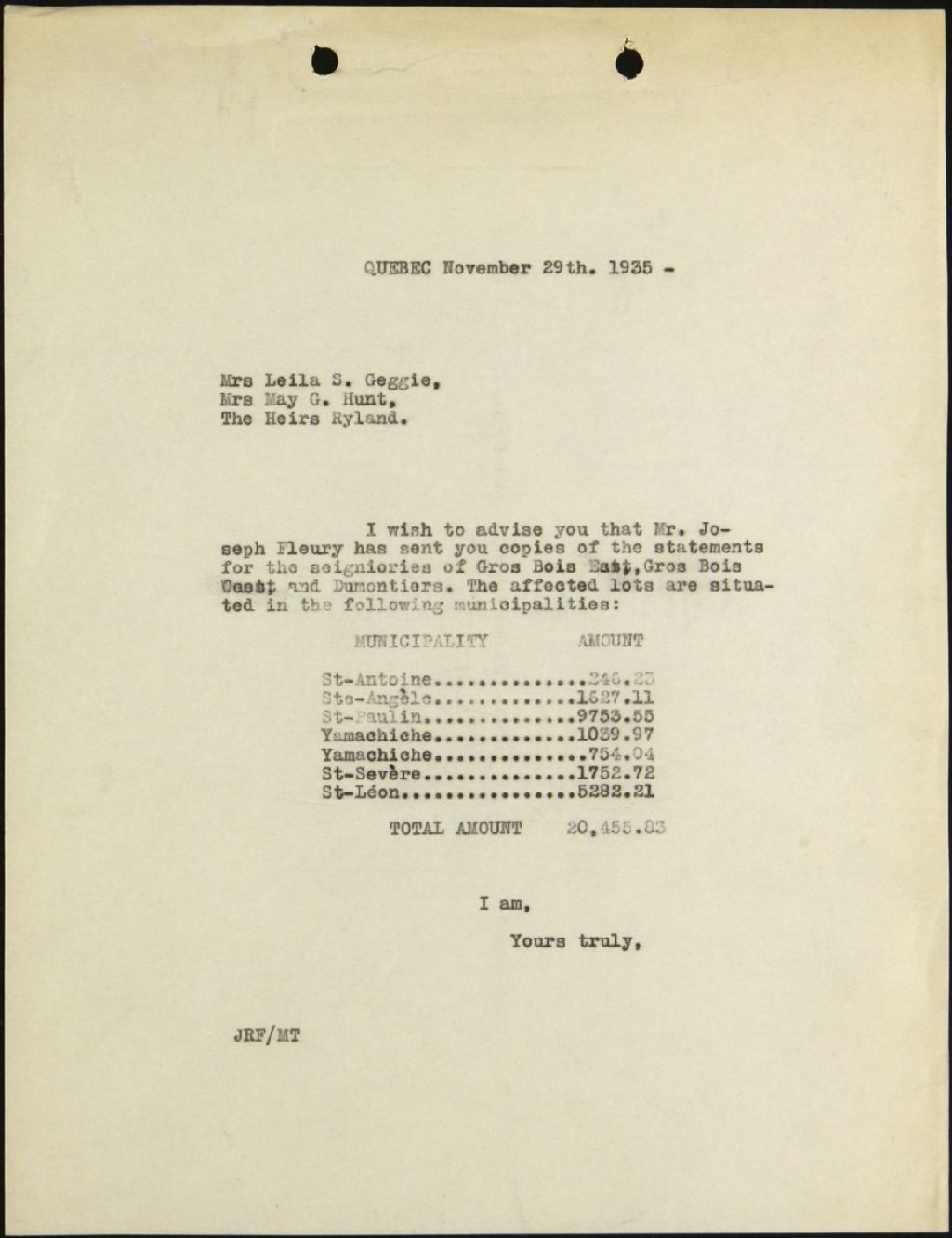 Leila Geggie et autres, seigneuries de Gros-Bois Est, Gros-Bois Ouest et Dumontier, 1935-1940, Archives nationales à Québec, Fonds Syndicat national du rachat des rentes seigneuriales, (03Q,E39,S100,SS2,D118).
