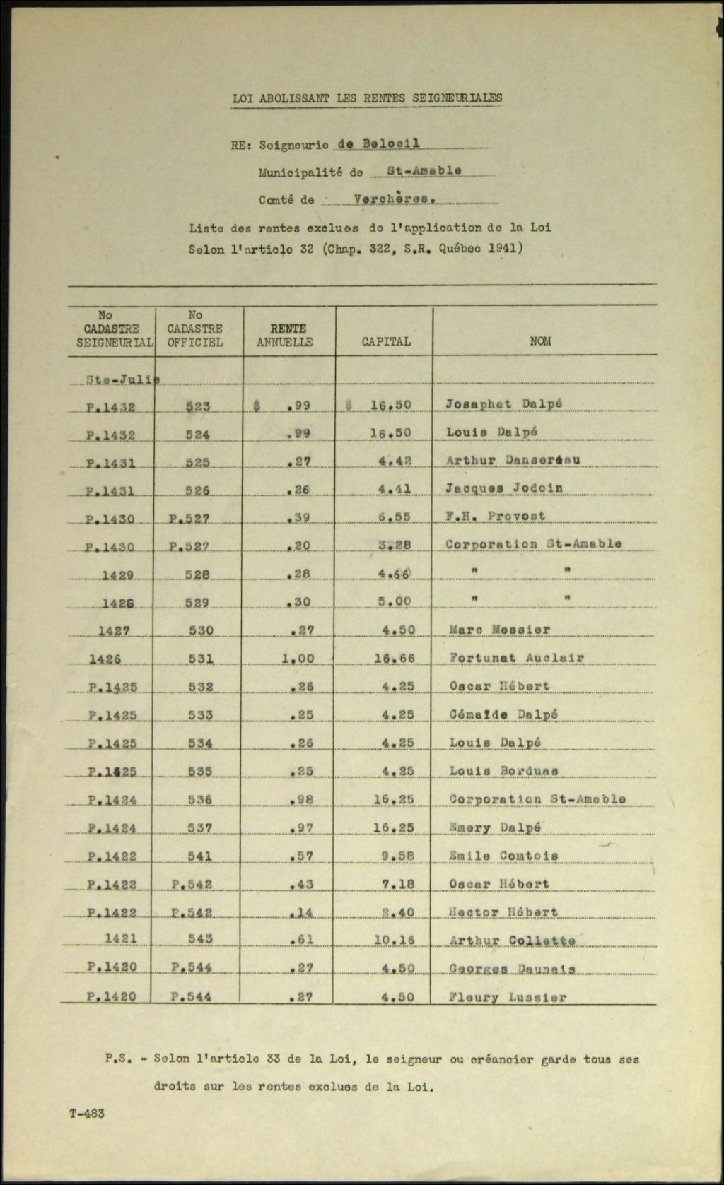 Shurland Beresford Bell et autres, seigneurie de Beloeil, 1935-1940, Archives nationales à Québec, Fonds Syndicat national du rachat des rentes seigneuriales, (03Q,E39,S100,SS2,D13).