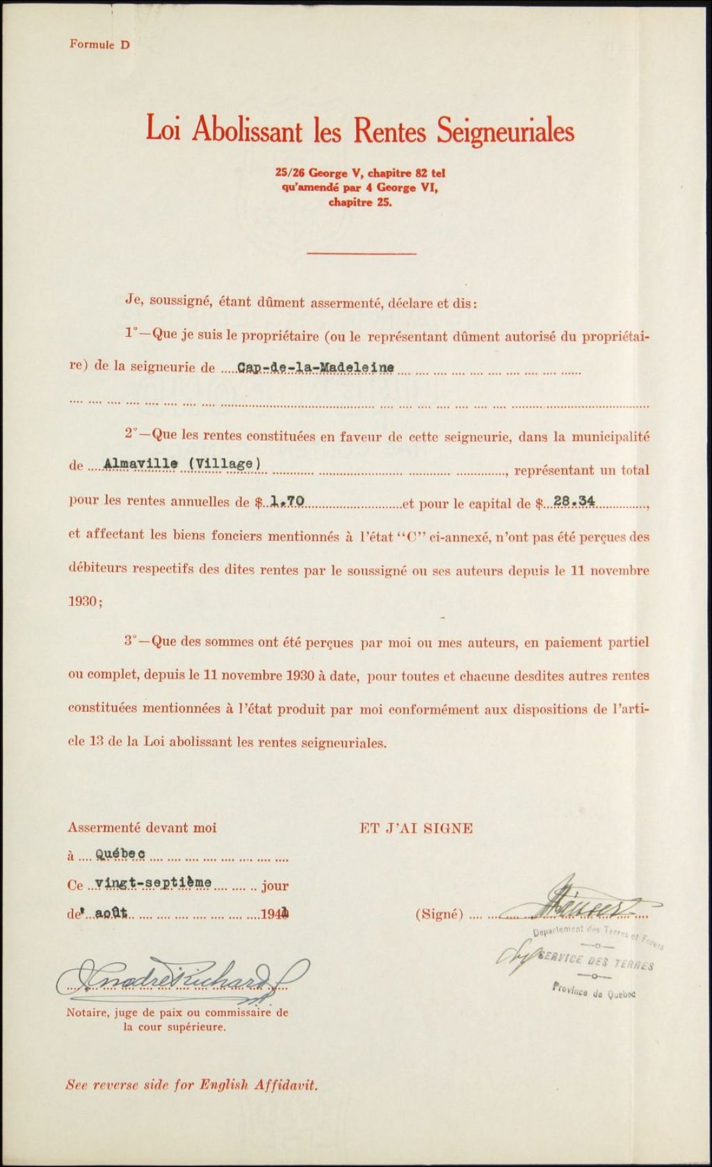 Gouvernement du Québec, seigneurie de Cap-de-la-Madeleine, 1935-1940, Archives nationales à Québec, Fonds Syndicat national du rachat des rentes seigneuriales, (03Q,E39,S100,SS2,D144).