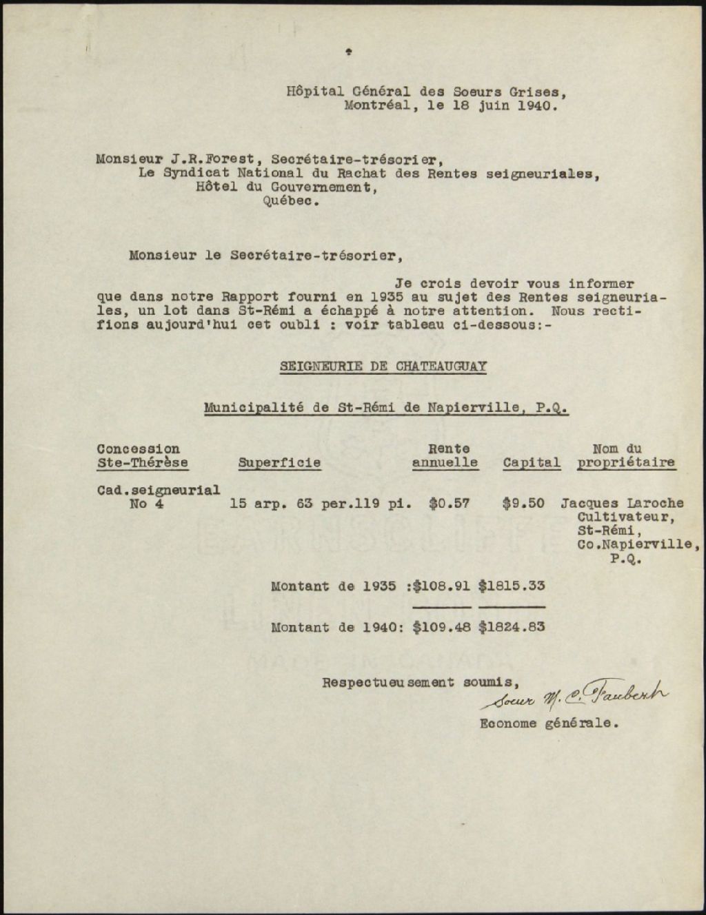 - Hôpital Général des Sœurs Grises de Montréal, seigneuries de Châteauguay et Chambly