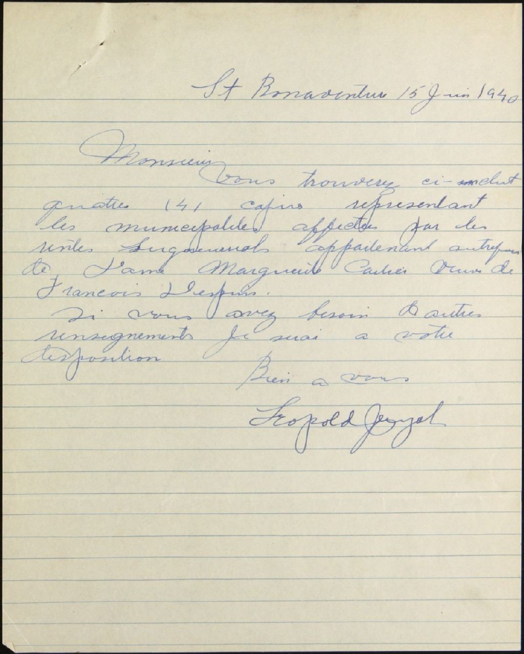 Léopold Joyal et Edouard Despin, seigneurie La Baie du Febvre, 1935-1940, Archives nationales à Québec, Fonds Syndicat national du rachat des rentes seigneuriales, (03Q,E39,S100,SS2,D172).