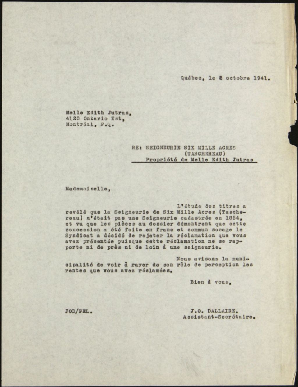 - Mademoiselle Édith Jutras, seigneurie de Taschereau