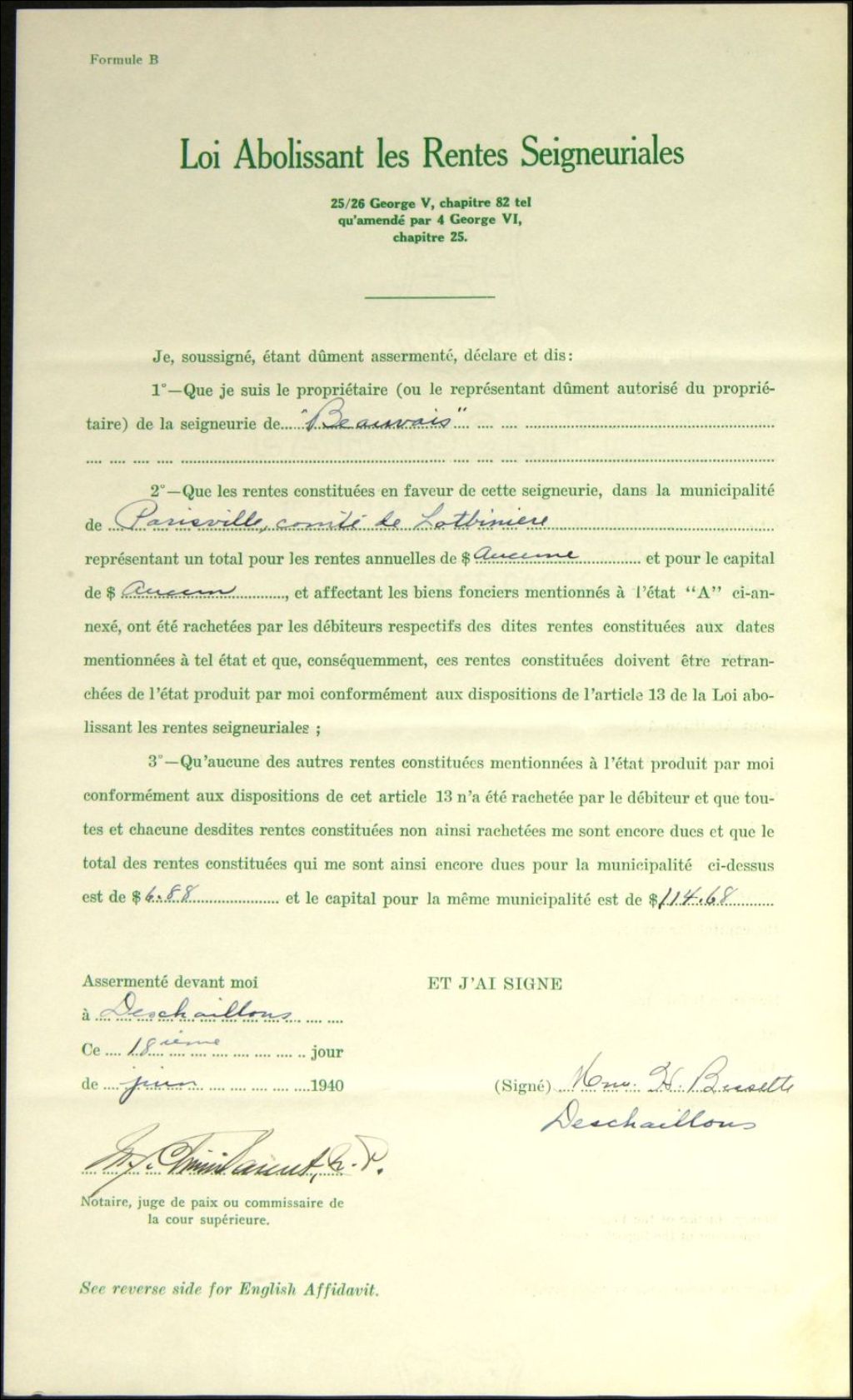 Madame Henri Bessette, succession Od. Candonnet, seigneurie de Beauvais