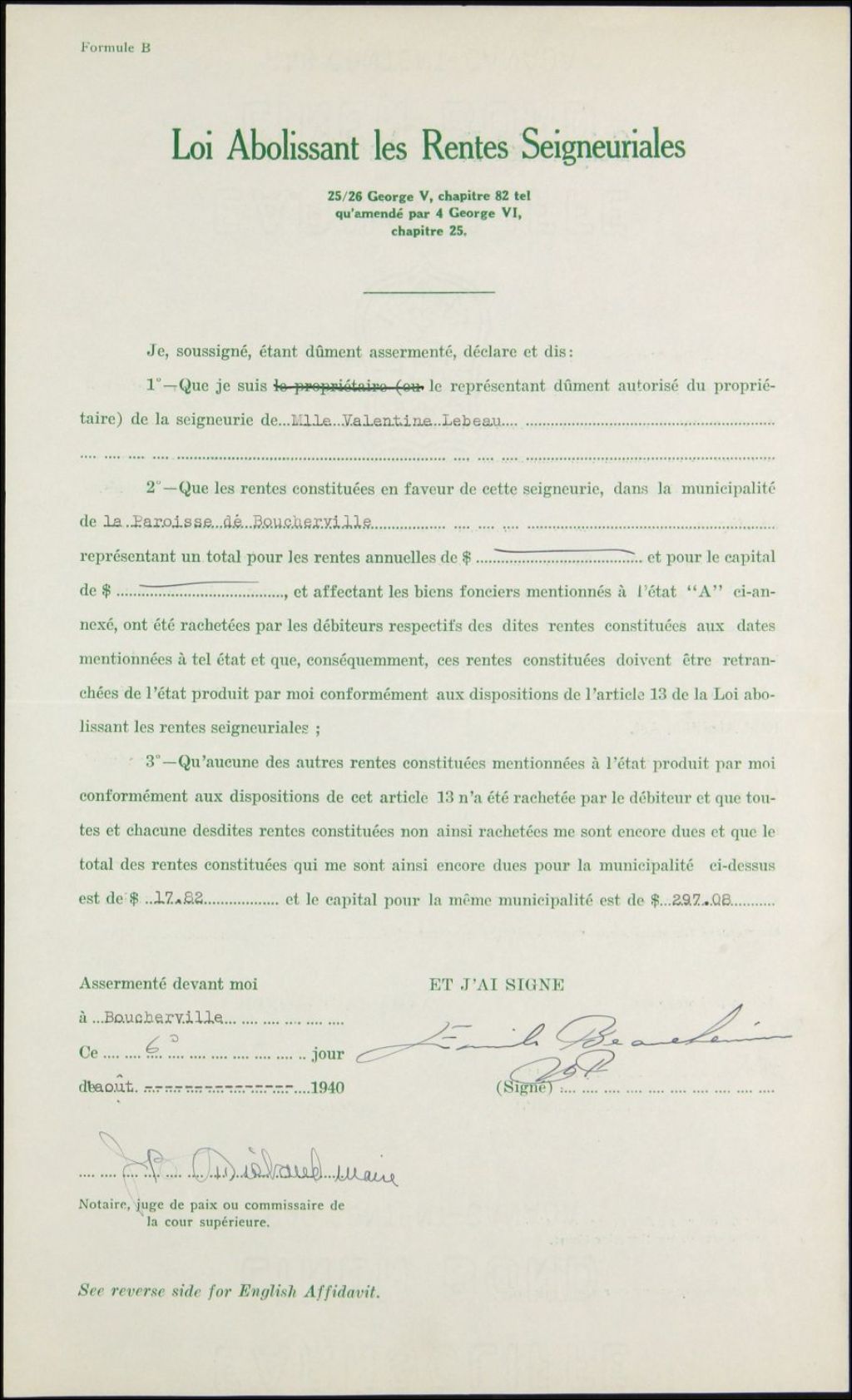 - Mademoiselle Valentine Lebeau, seigneurie de Boucherville Lettre "N"