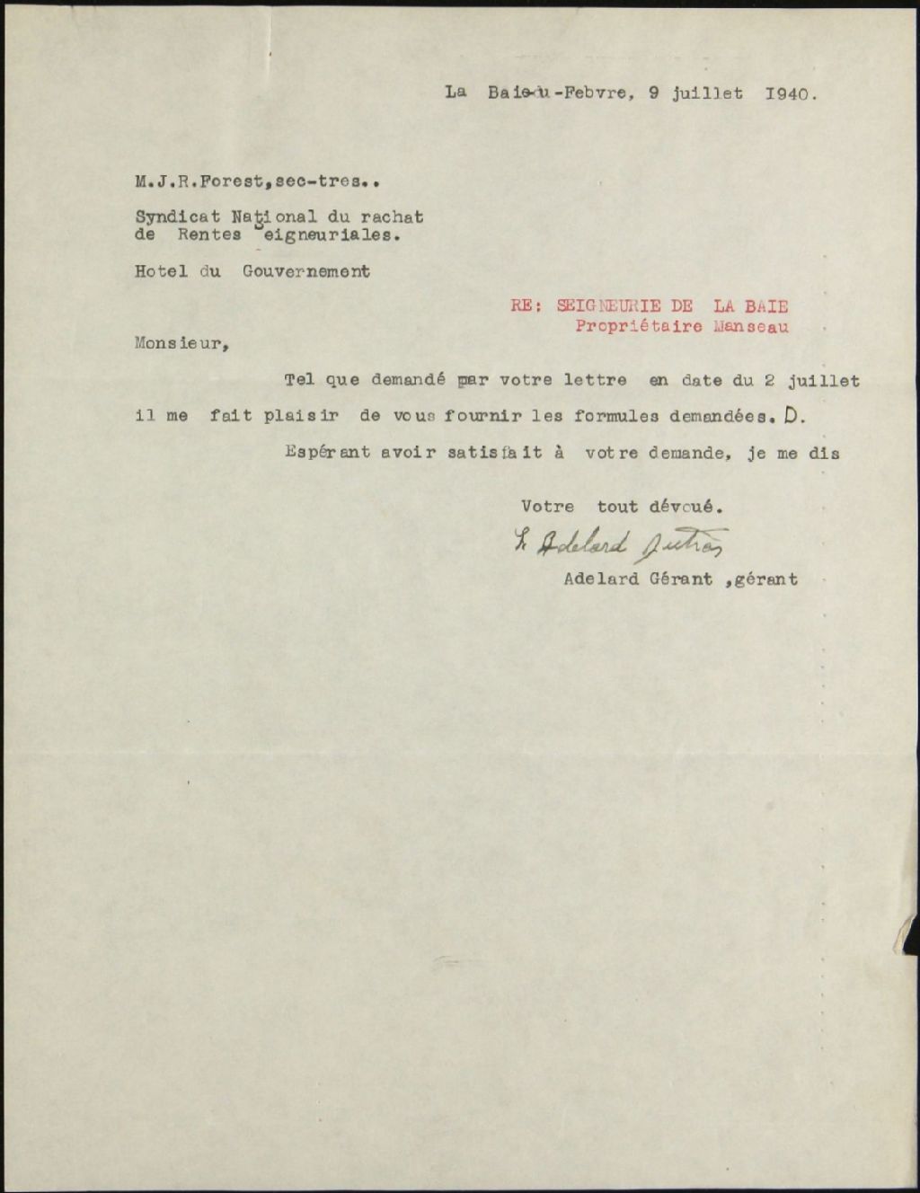 Dame Alfred Barnabé Cordeli Manseau et autres, seigneurie de La Baie du Febvre, 1935-1940, Archives nationales à Québec, Fonds Syndicat national du rachat des rentes seigneuriales, (03Q,E39,S100,SS2,D192).