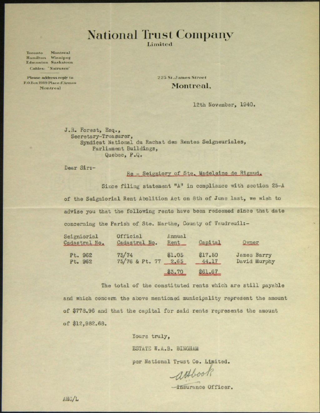 Succession W. A. B. Bingham, seigneurie de Sainte Madeleine de Rigaud