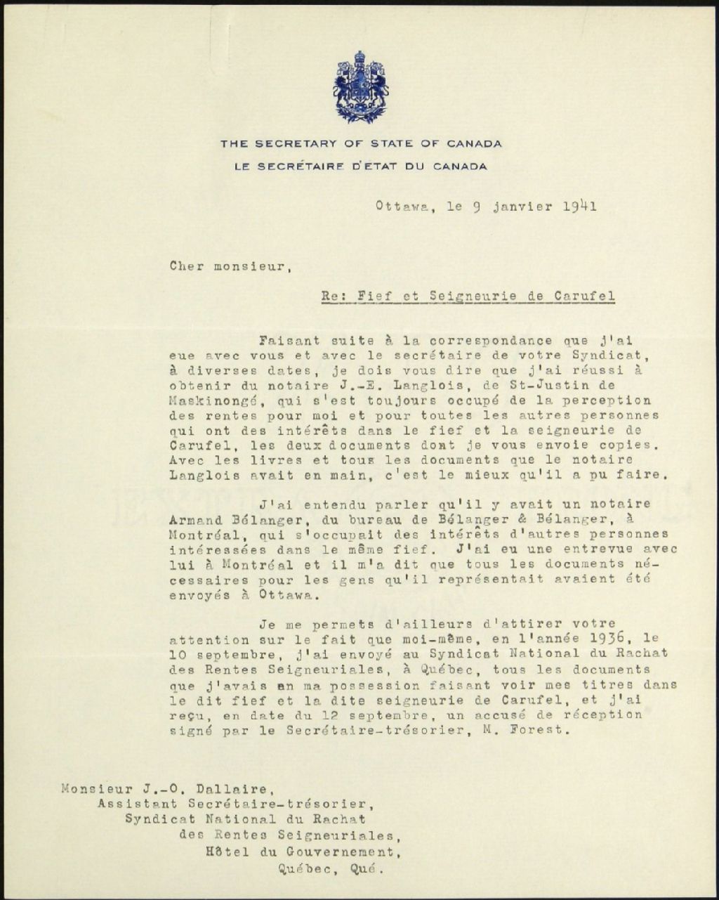 Héritiers Morrisson, seigneurie de Carufel, 1935-1940, Archives nationales à Québec, Fonds Syndicat national du rachat des rentes seigneuriales, (03Q,E39,S100,SS2,D212).