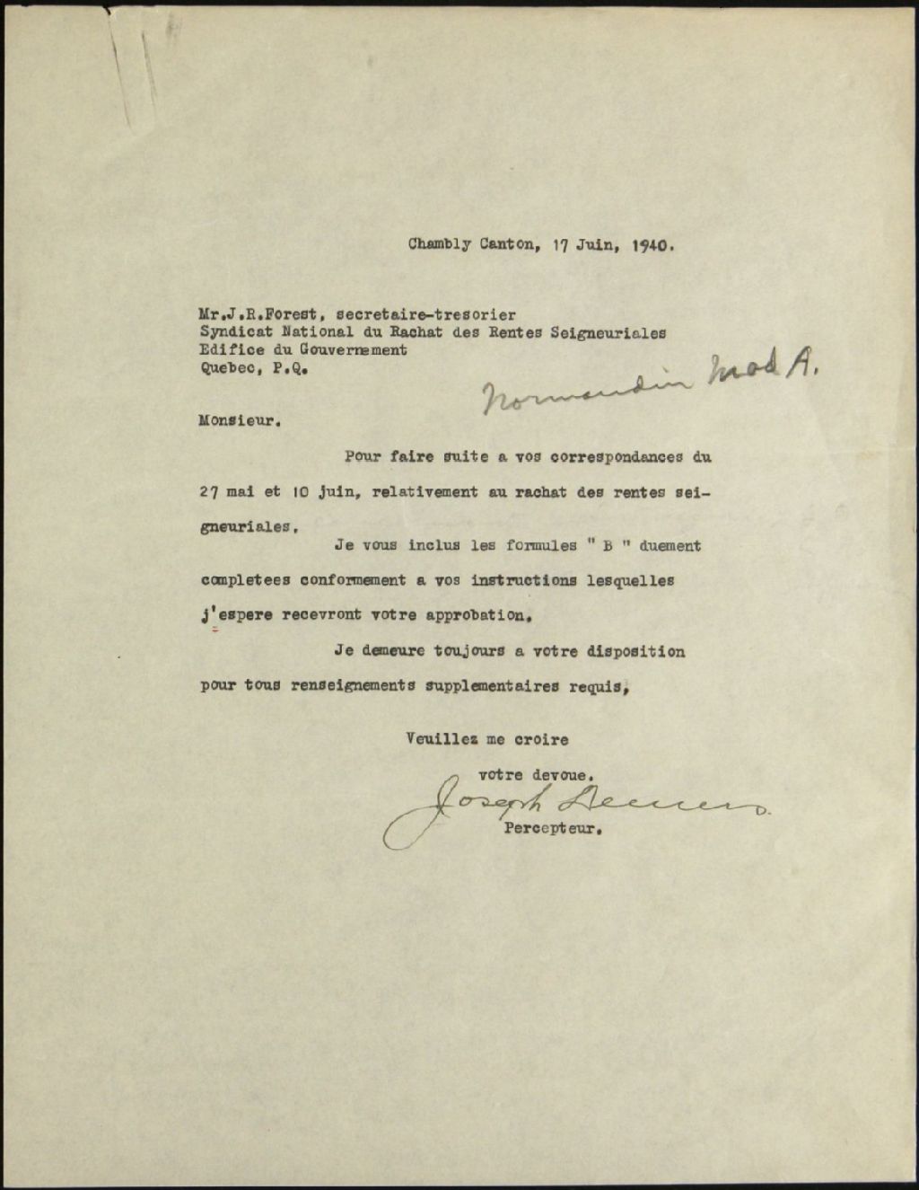 Madame A. Normandin, seigneuries de Chambly Est et Ouest, 1935-1940, Archives nationales à Québec, Fonds Syndicat national du rachat des rentes seigneuriales, (03Q,E39,S100,SS2,D216).