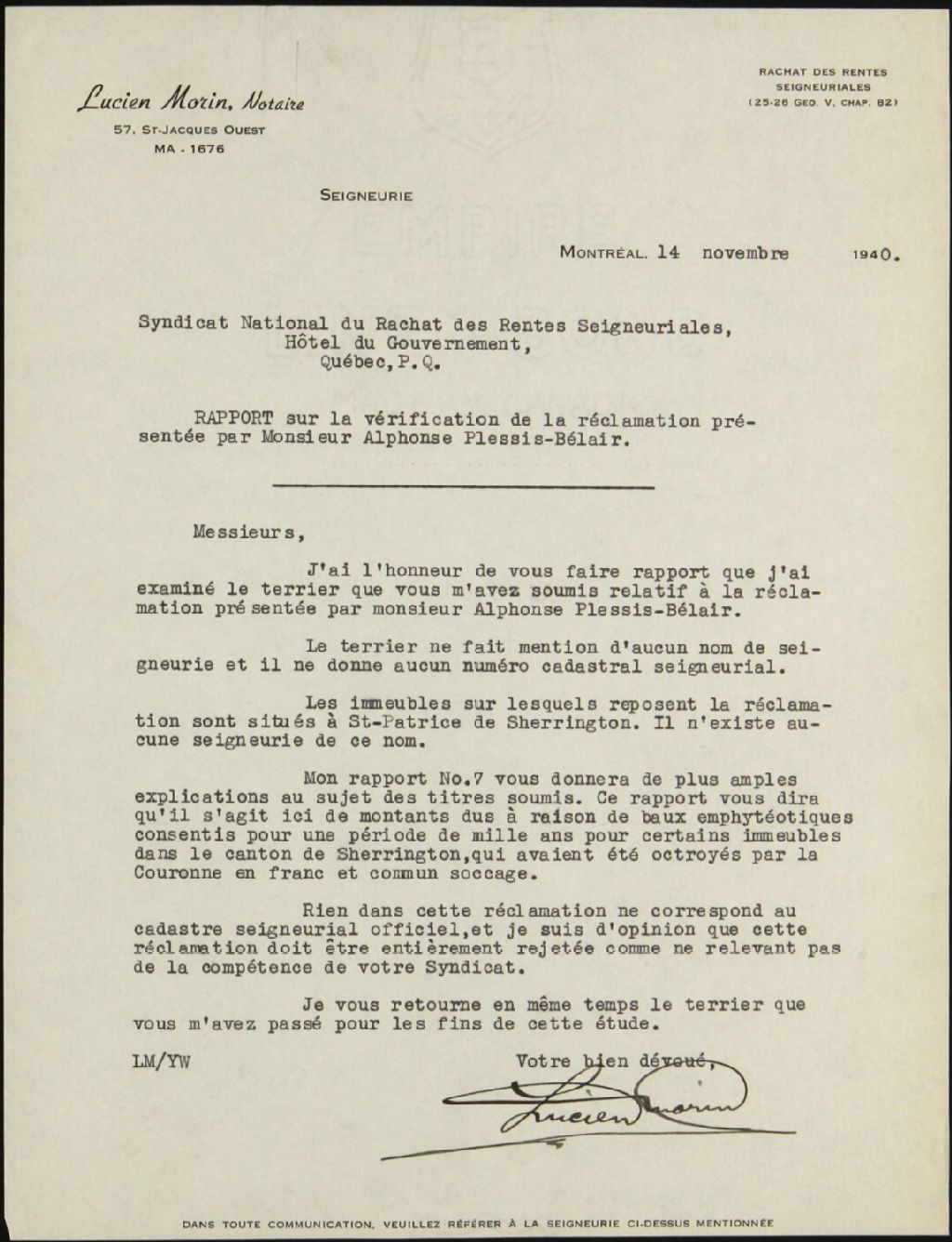 Alphonse Plessis-Bélair, seigneurie de Laviolette, 1935-1940, Archives nationales à Québec, Fonds Syndicat national du rachat des rentes seigneuriales, (03Q,E39,S100,SS2,D223).