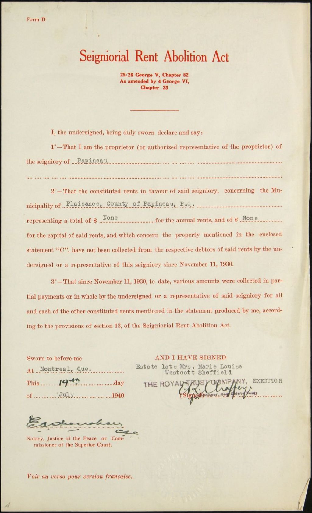 Marie-Louise Westcott Sheffield, seigneurie de Papineau, 1935-1940, Archives nationales à Québec, Fonds Syndicat national du rachat des rentes seigneuriales, (03Q,E39,S100,SS2,D253).