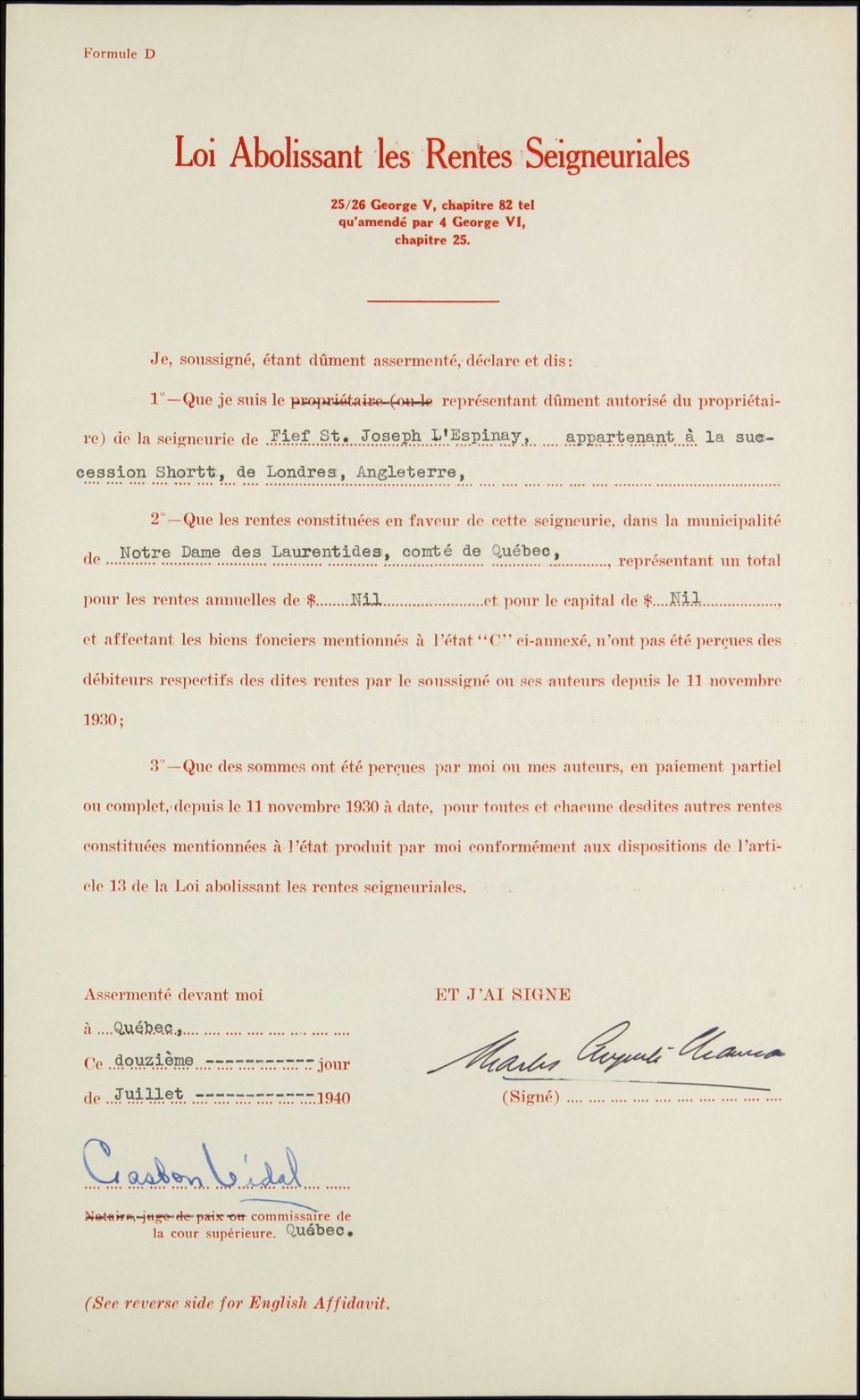 - Héritiers Shortt, seigneuries de Bourg Royal, Saint-Joseph et L'Espinay